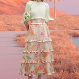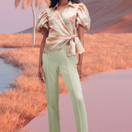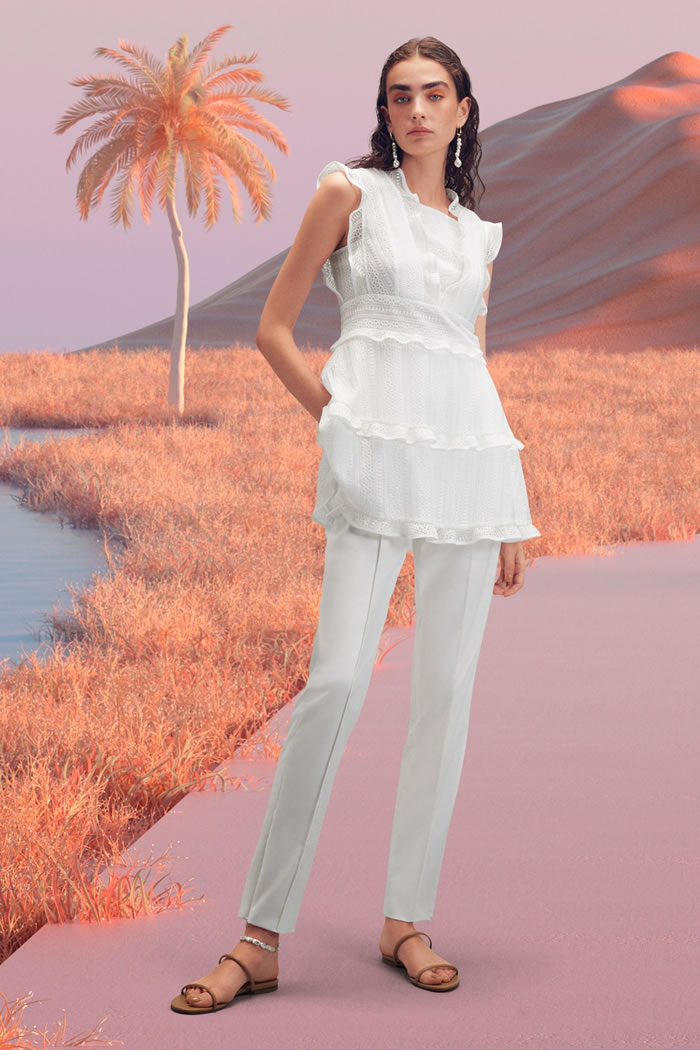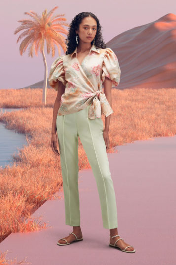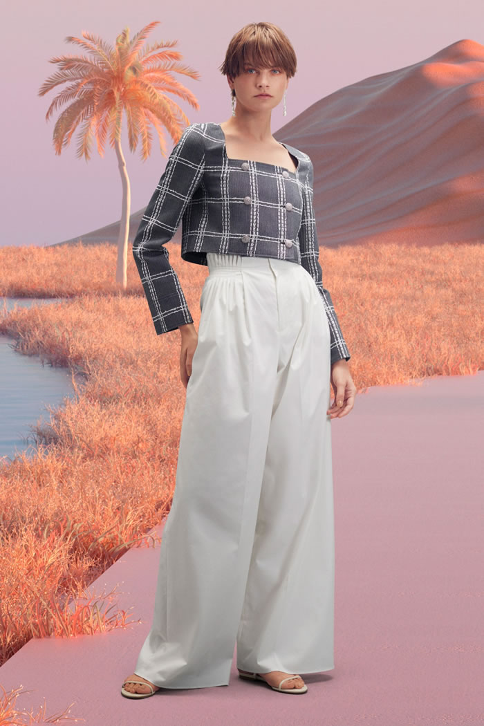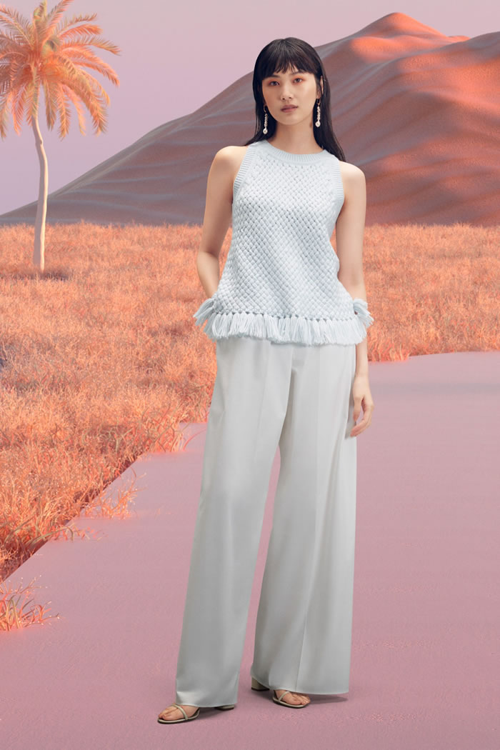 The label’s take on a Hawaiian print (you know, the kind that tourist dads wear?) appears on satin twill in blouses and dresses. A standout look is a baby blue basketweave tank top with fringe paired with coordinating wide-leg trousers. A little edge would have been nice, but our stay at Adeam Island was certainly easy breezy.