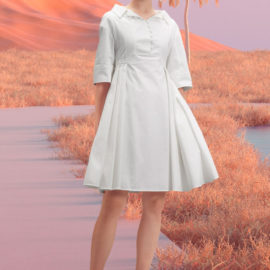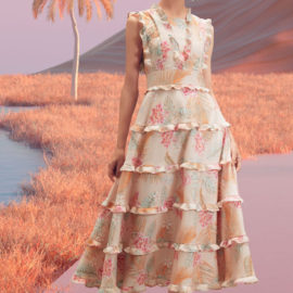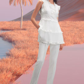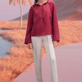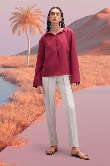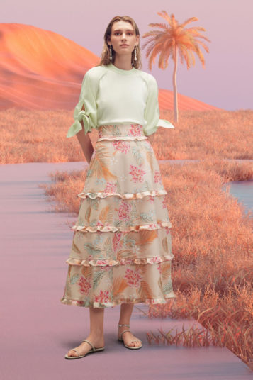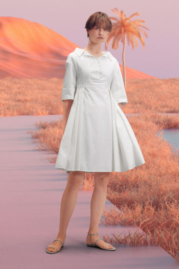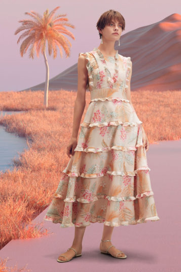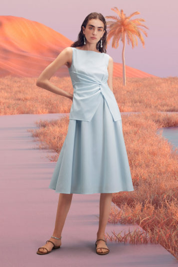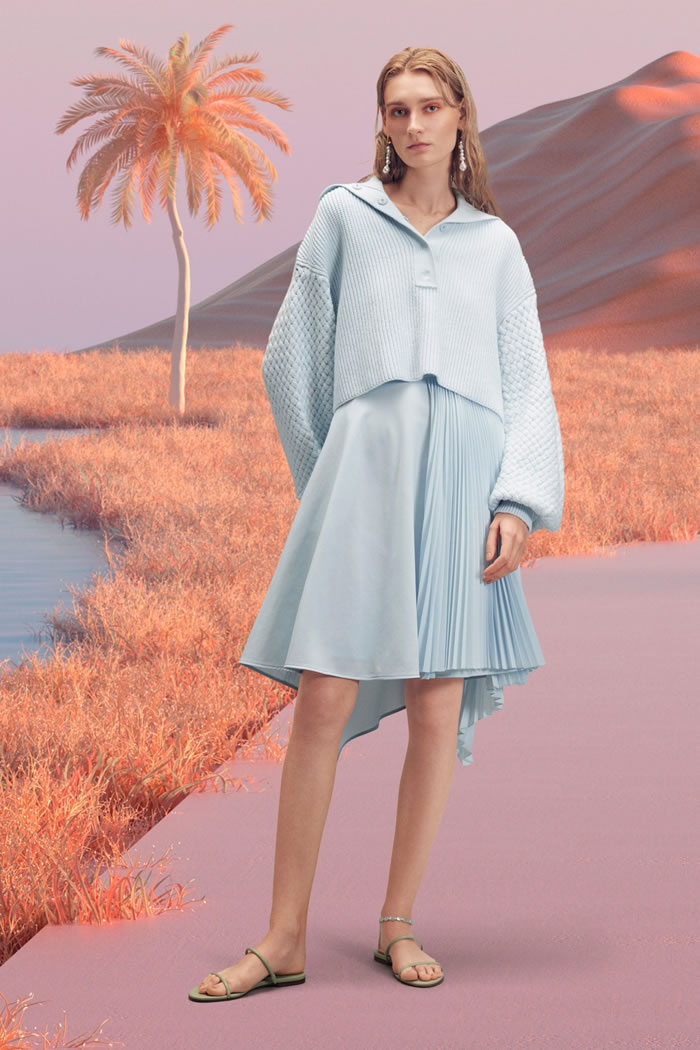 The resulting digital show’s CGI landscape, Adeam Island, is rosy with crystal blue waters punctuated improbably by palm trees. The models walk along a narrow strip that calls to mind the highway around Australia’s famous pink lake.