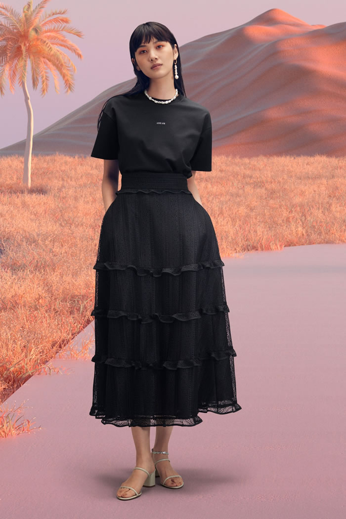 That is true to the longstanding vision of the Adeam woman. Maeda is known for creating ever-appropriate feminine clothes that make just enough of a statement. This season, the most casual pieces are a souvenir-like graphic T-shirt and an anklet made from shells and baroque pearls.