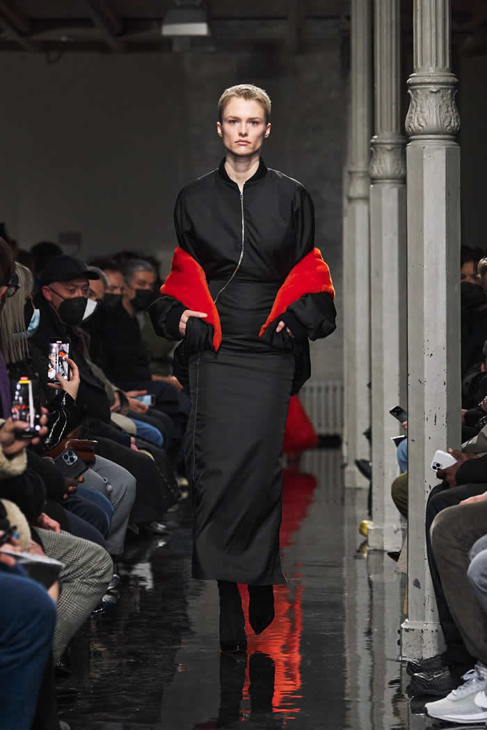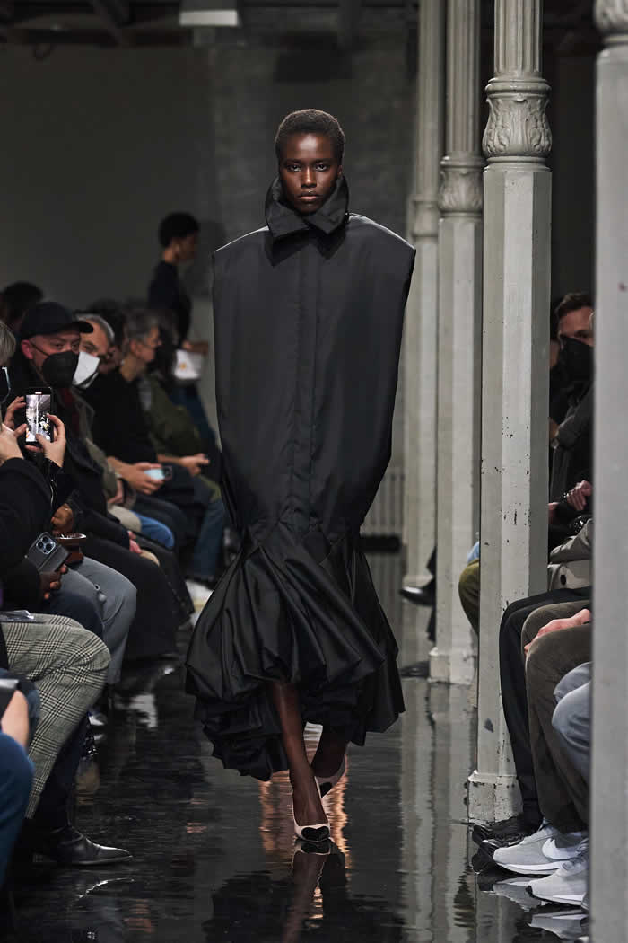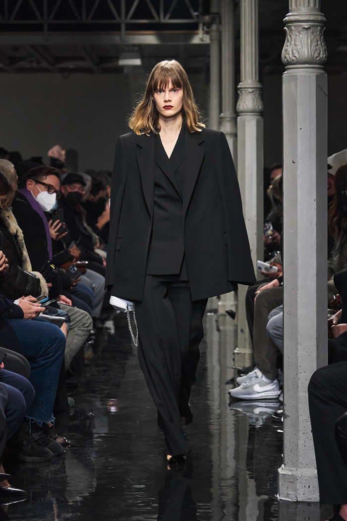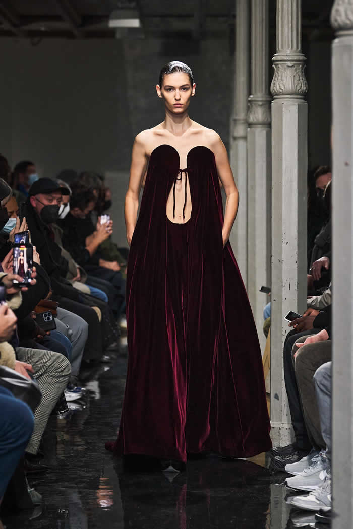 Mulier said that “the little bit more” he had added of himself to the collection’s genetics was mainly tailoring-focused. That was clear in those coats, but also in louche suits and tuxedos, which accomplished a delicately oversized line that didn’t get overwhelming.