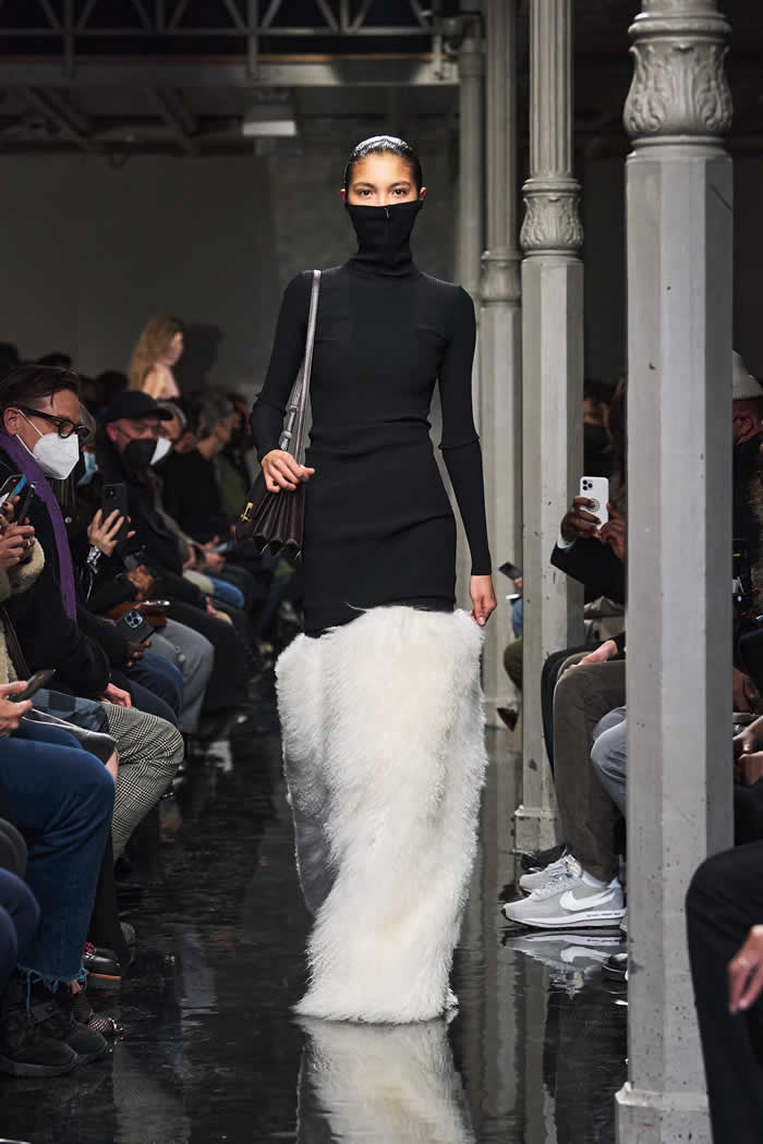 A series of knitted dresses with face coverings executed in close collaboration with the Picasso Foundation (Azzedine Alaïa was a collector and friend of the family) interpreted ceramics created by the artist in the 1940s through impressive embroideries that turned the models’ physiques into optical illusions.