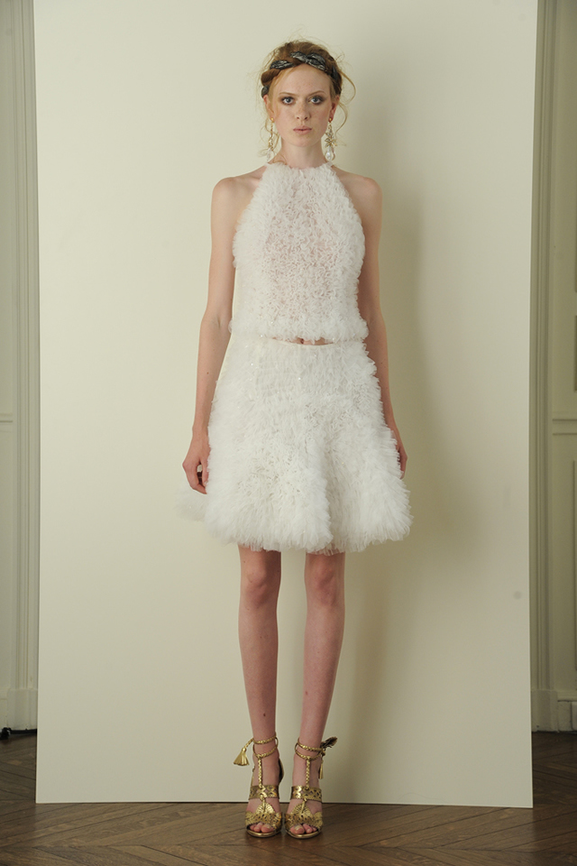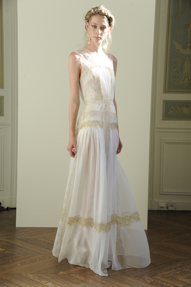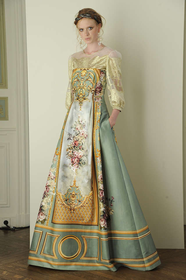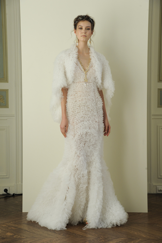 Long ball gowns and coats were richly decorated with floral garland paintings or embroideries to mirror the 19th-century gilded wood panels of the rooms. Others conveyed a Renaissance romanticism, as in delicate flowing chiffon gowns with lace embellishment or diagonal pleated frills in shades of beige, icy gray or cornflower blue. The finale of white dresses with dense tulle frills dusted with crystals were perfectly appropriate for a bride.