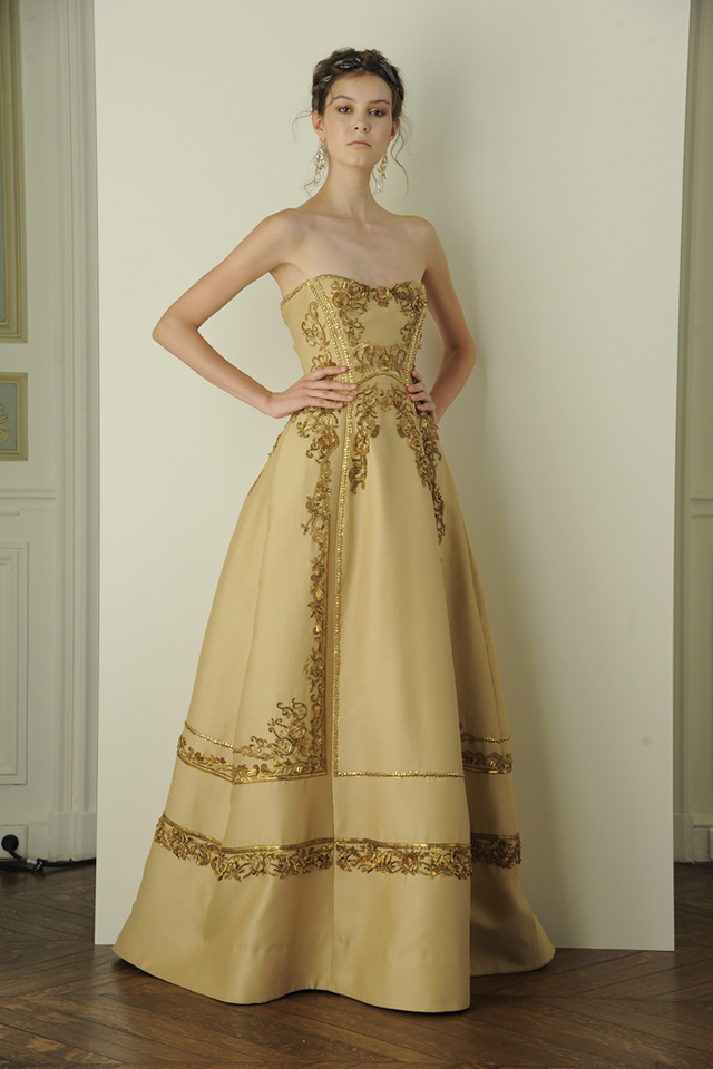 Accompanied by a live pianist, models wandered through the elaborate salons and garden, a setting apropos of the collection, which is priced about 25 to 30 percent more than the signature line and designed for grand events.