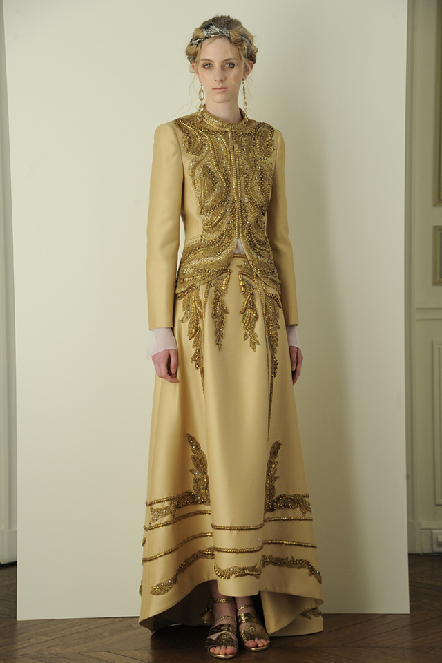Long ball gowns and coats were richly decorated with floral garland paintings or embroideries to mirror the 19th-century gilded wood panels of the rooms. Others conveyed a Renaissance romanticism, as in delicate flowing chiffon gowns with lace embellishment or diagonal pleated frills in shades of beige, icy gray or cornflower blue. The finale of white dresses with dense tulle frills dusted with crystals were perfectly appropriate for a bride.