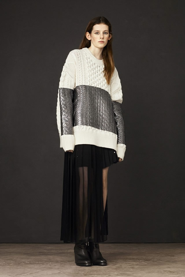 An oversize cream cricket sweater was inset with a panel of industrial-looking silver foil and teamed with a floaty, asymmetric chiffon skirt, while a shiny silver tailored jacket was crafted from cork layered with silver foil and paired with a matching miniskirt.