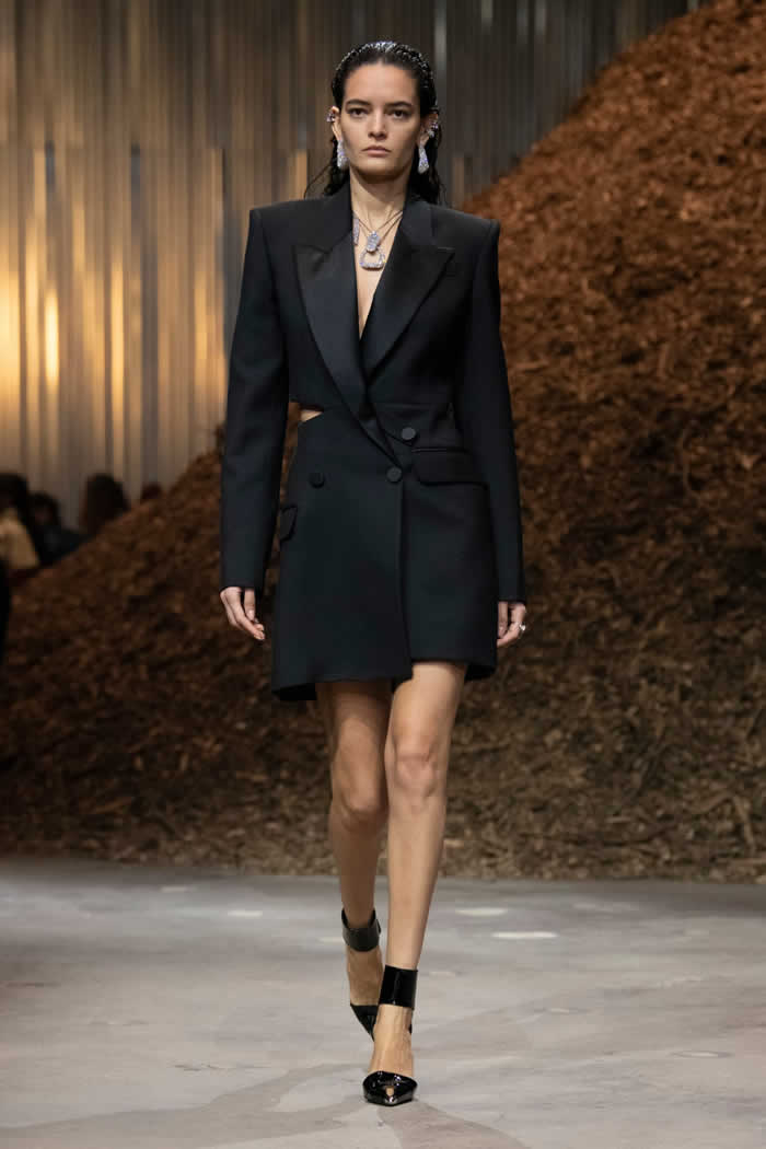 This show was rooted in the elements, as well, though it wasn’t water that was her focus, but earth. Piles of mulch made from fallen trees gave off a peaty tang in the Brooklyn warehouse venue (it’ll be reused in plantings, she said), and birds and insects chirped on the speakers before the soundtrack settled into the groove of “A Forest” by The Cure.