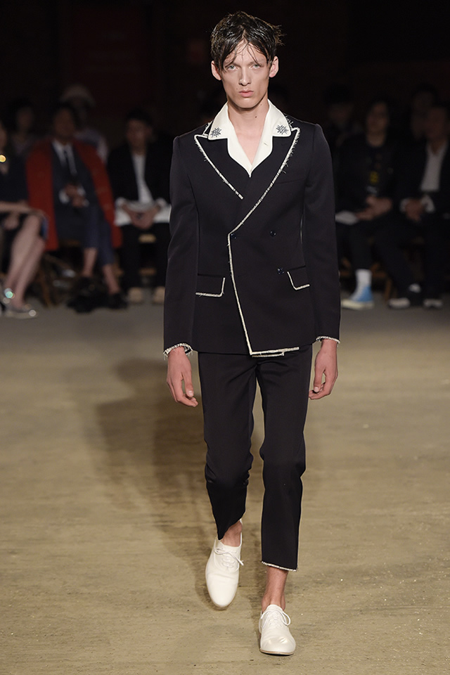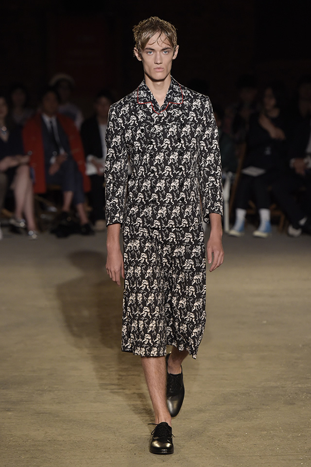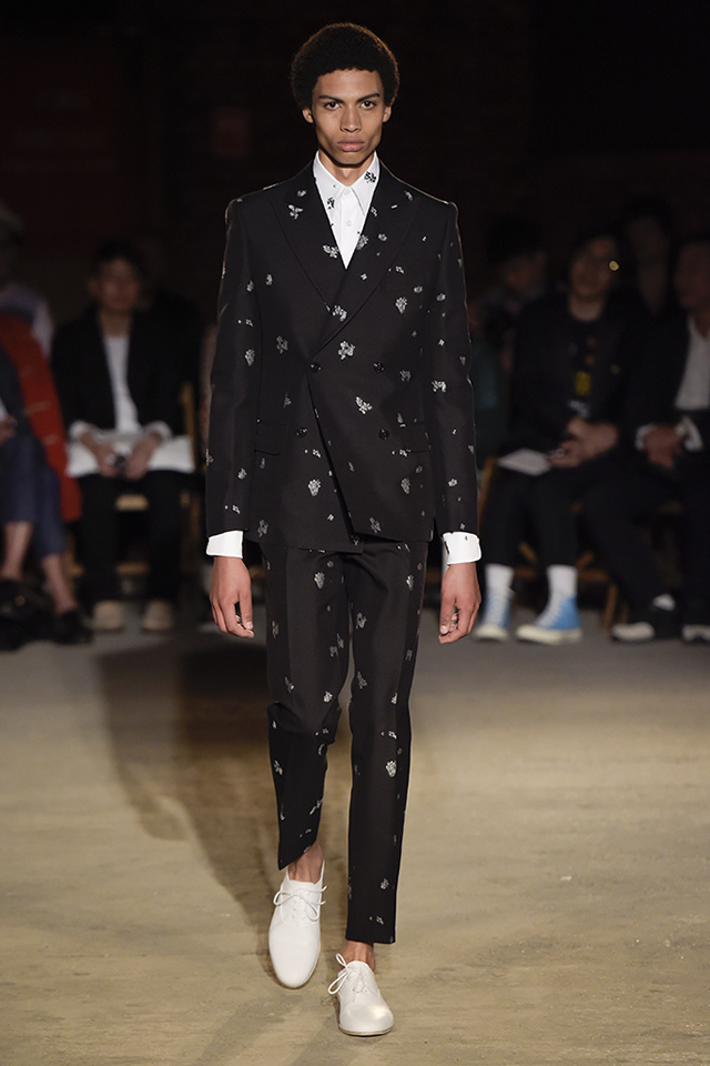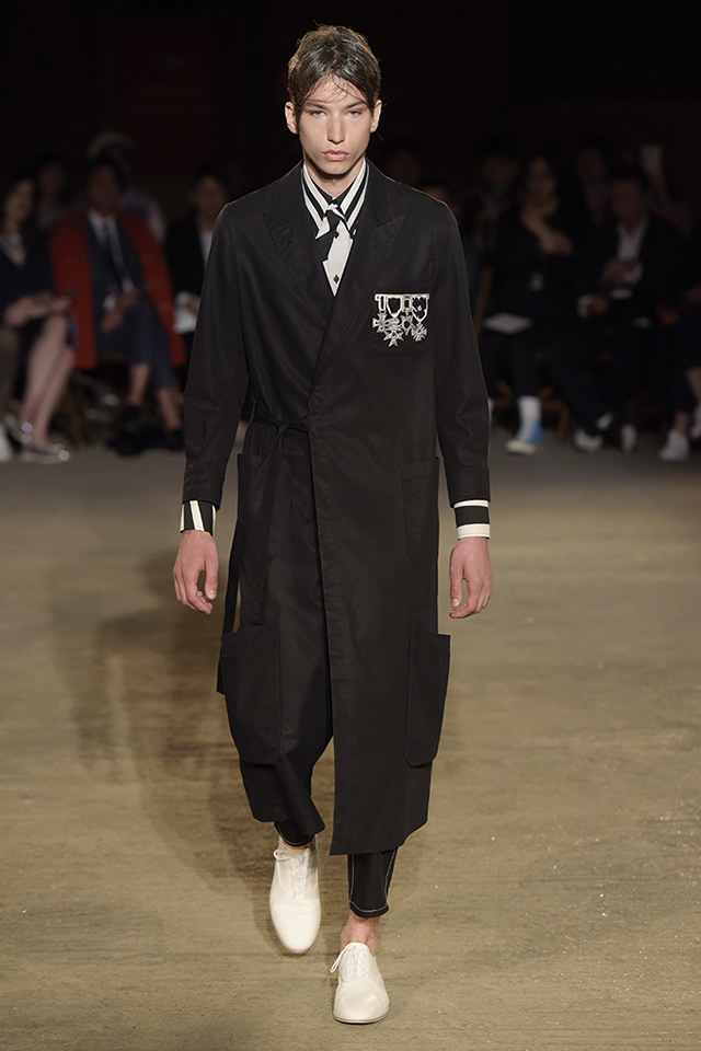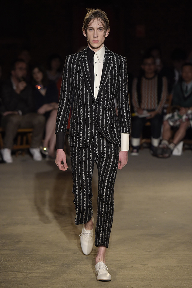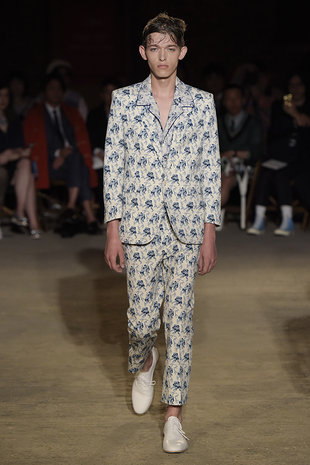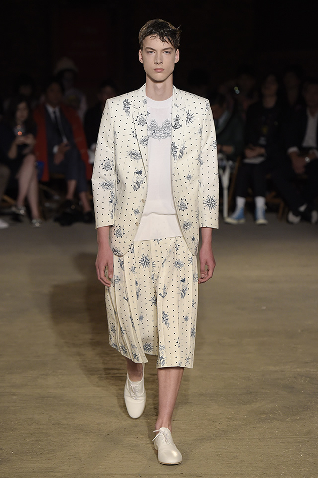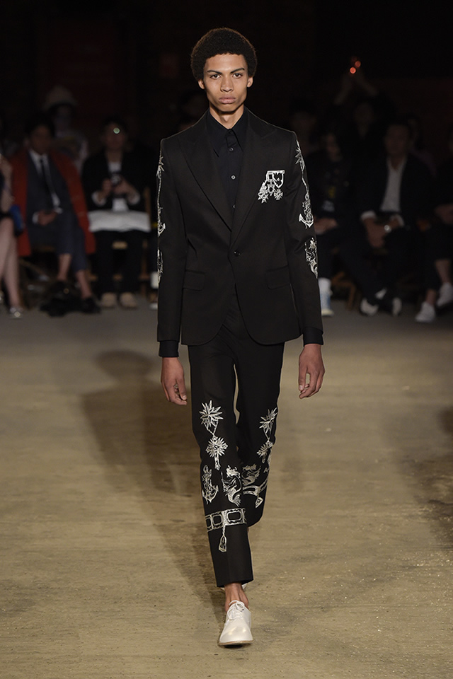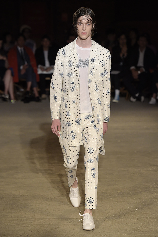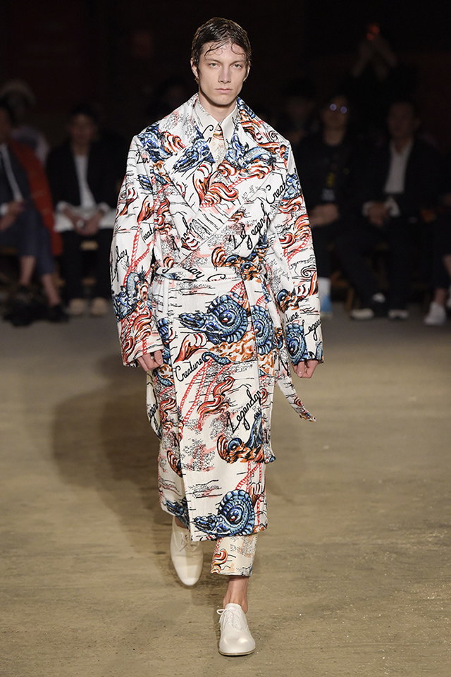 The tattoo prints – mostly mermaids, anchors and compasses – also could be seen on shirt cuffs and pointy collars, or splashed across duster coats and trenches. While some of the prints were overwhelming, climaxing with suits in the dazzle camouflage used on warships, or colorful souvenir scarf prints of sea monsters, Burton’s fine, strong-shouldered cutting could not be disguised.