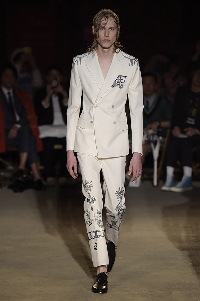As fashion moves so fast, putting tattoos on your clothes rather than your skin seems like a clever idea, not a cop out. Sarah Burton planted a collar of inky scrolls across the lapels of a white cotton officer coat to open the Alexander McQueen show, announcing its seafaring theme and her single-minded focus on tailoring.