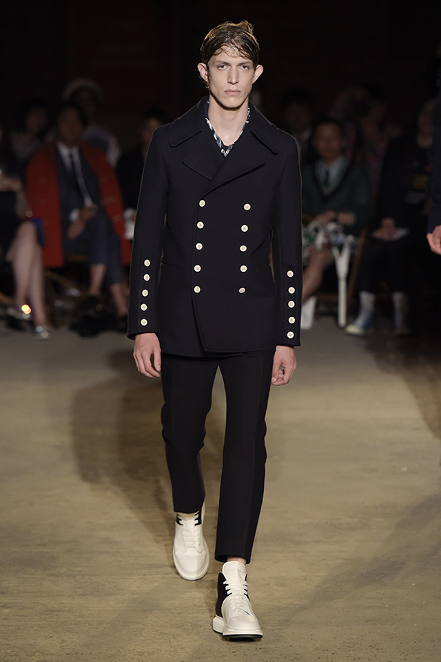 The tattoo prints – mostly mermaids, anchors and compasses – also could be seen on shirt cuffs and pointy collars, or splashed across duster coats and trenches. While some of the prints were overwhelming, climaxing with suits in the dazzle camouflage used on warships, or colorful souvenir scarf prints of sea monsters, Burton’s fine, strong-shouldered cutting could not be disguised.