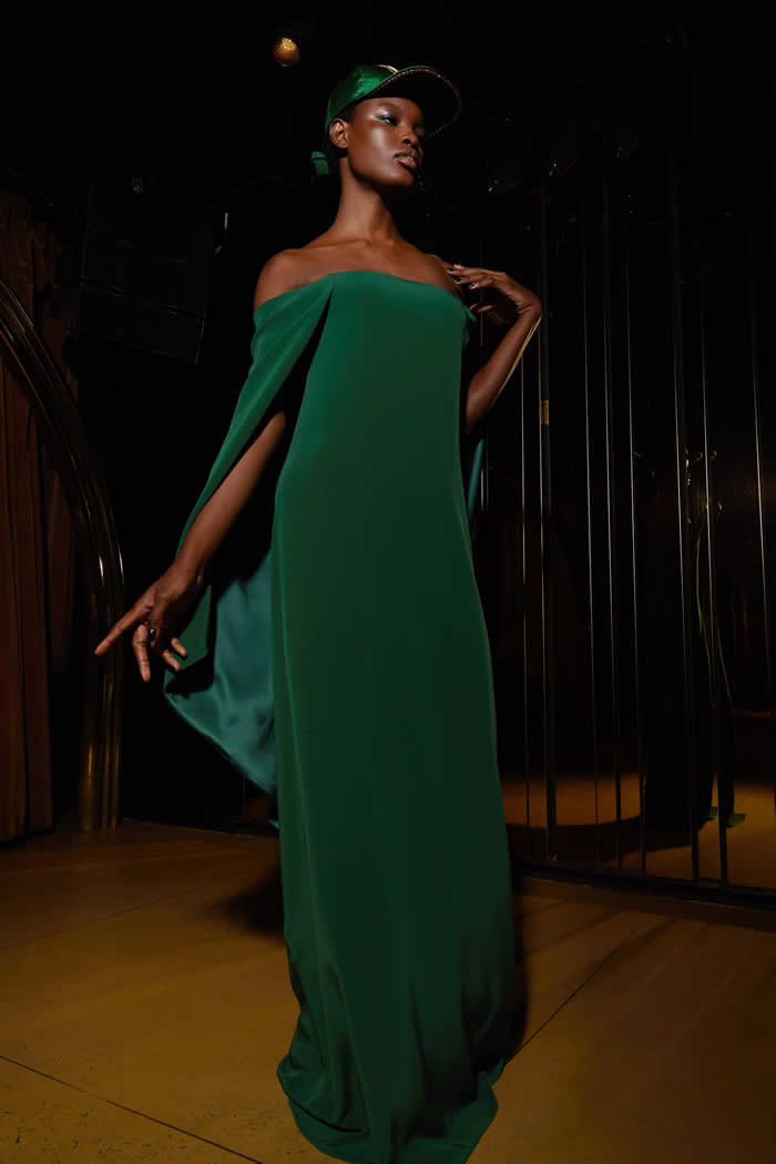 While crêpe designs — in navy with rectangular draped sleeves and a button front, or in green with a cape covering but not restricting the arms — were more fluid. For an added fun factor, and with a nod to a younger consumer, there was even a range of satin baseball caps with a bejeweled “M” logo to match each dress.