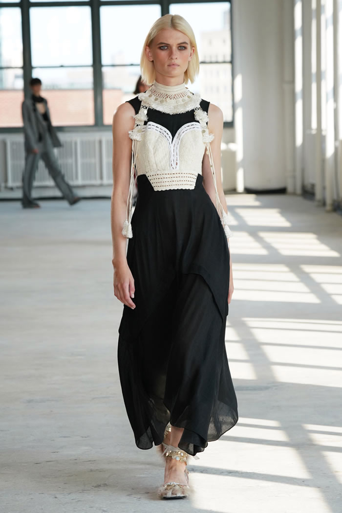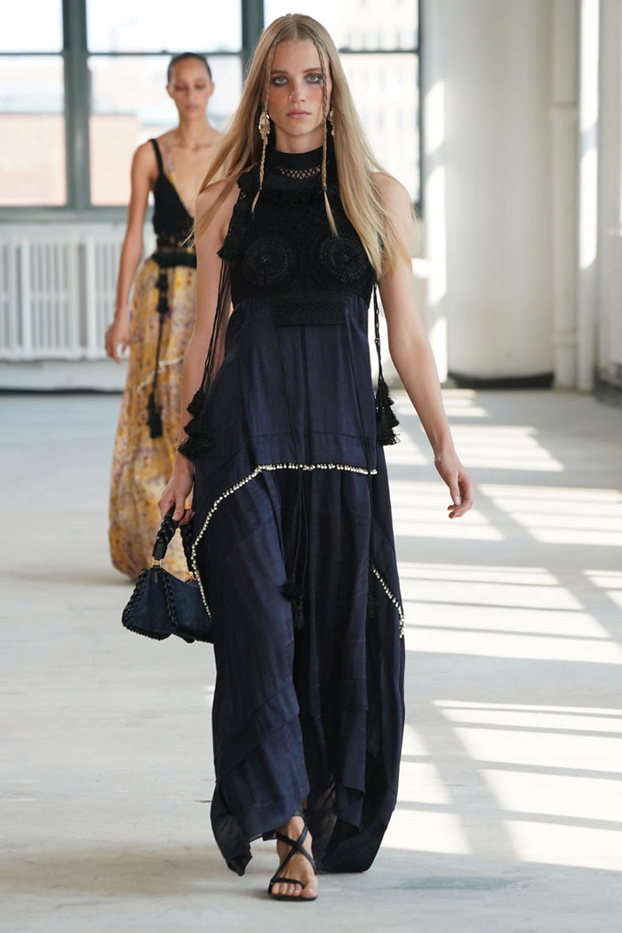 Shibori-dyed dresses (an Altuzarra classic), cozy knotted and sarong-style knits, and airy maxi dresses in crochet bras, bodices and bibs evoked wanderlust while maintaining a sense of intimacy in their handcraft and tactility.