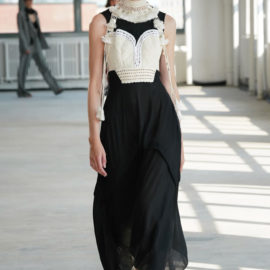 “We wanted to take an abandoned corporate office and reclaim it as a creative space,” he said of staging the show at 160 Varick, on a floor that was completely unfinished except for the yarn-bombed pillars at the center of the runway.