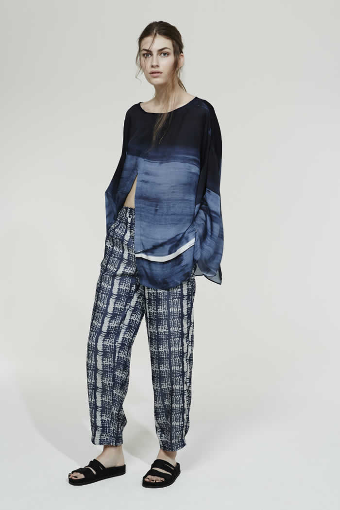 its skirts done in painterly blue stripes that were inspired by the work of the late artist Helen Frankenthaler, was knotted over an easy pair of embellished denim pants.