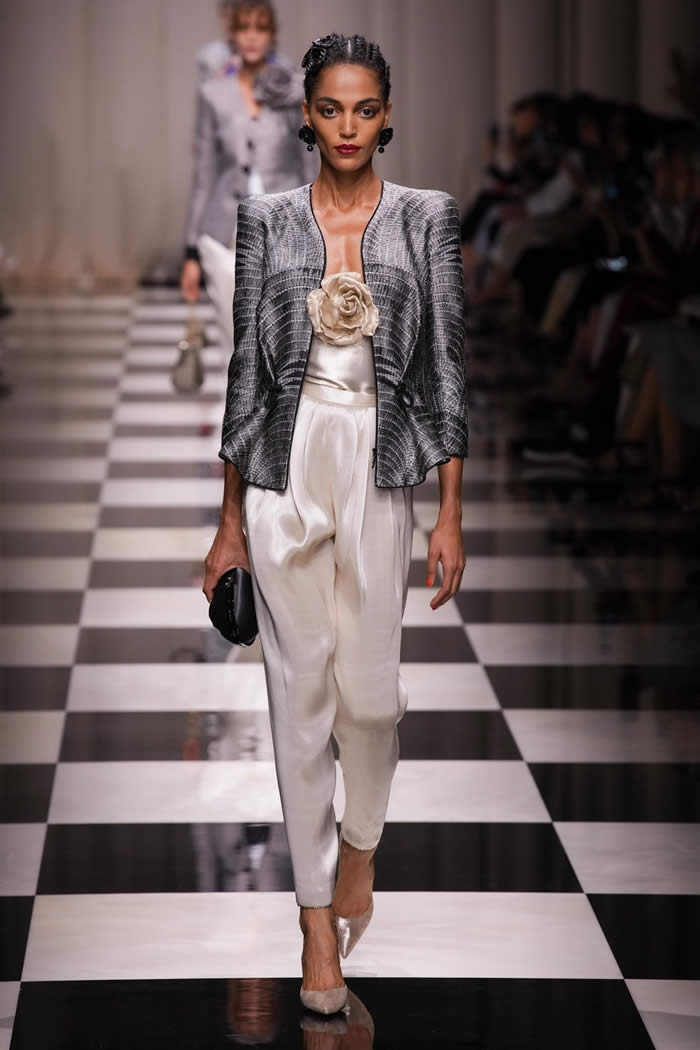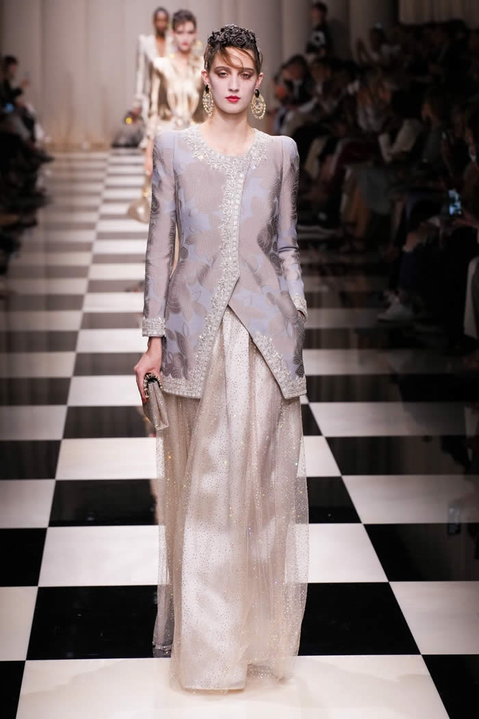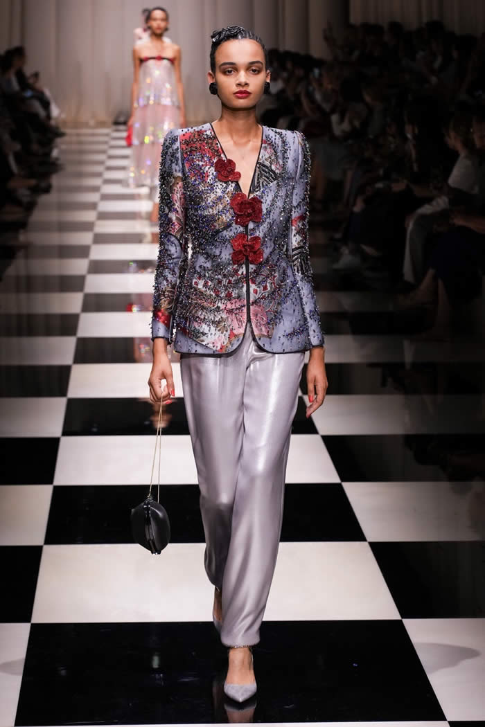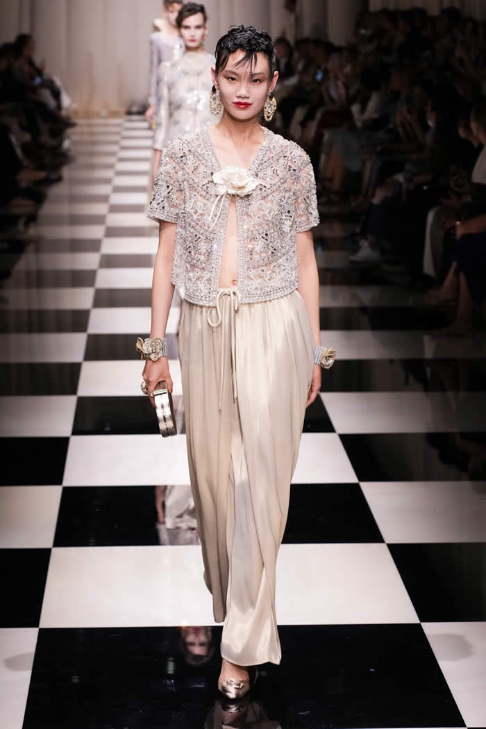 The runway came to life as models gracefully walked on a checkerboard surface, adorned in silky, tapered trousers paired with slim brocade jackets and exquisitely beaded shirts and tunics. While the couture season has witnessed a more subdued mood, Armani deviated from the norm, opting for lustrous fabrics, lavish embellishments, and an abundance of crystals and beadwork.