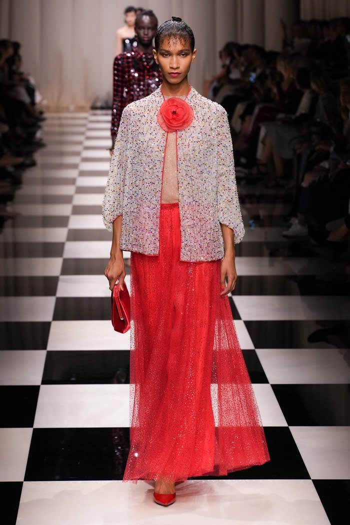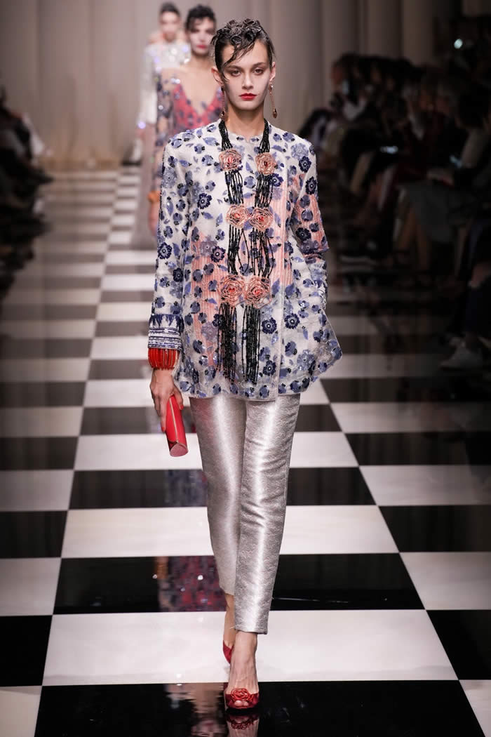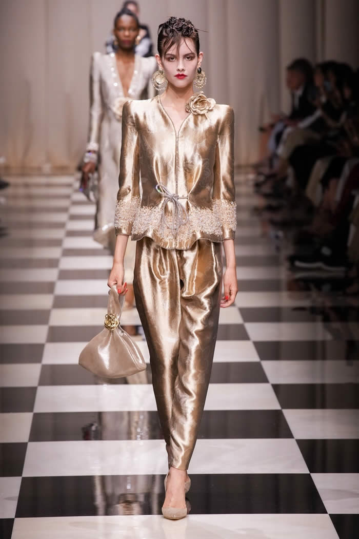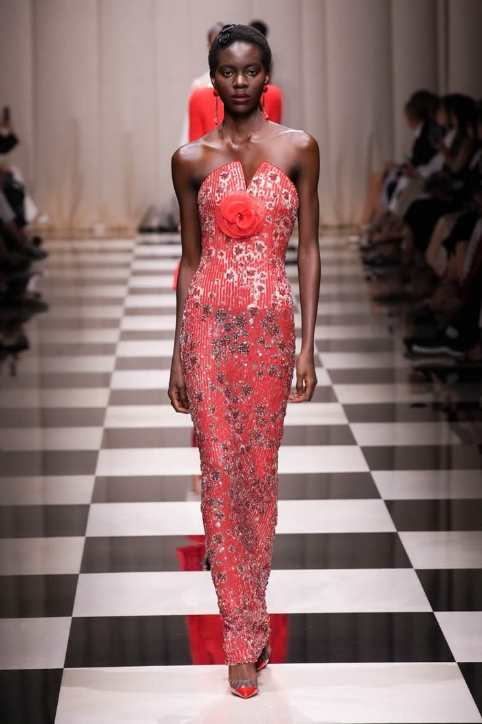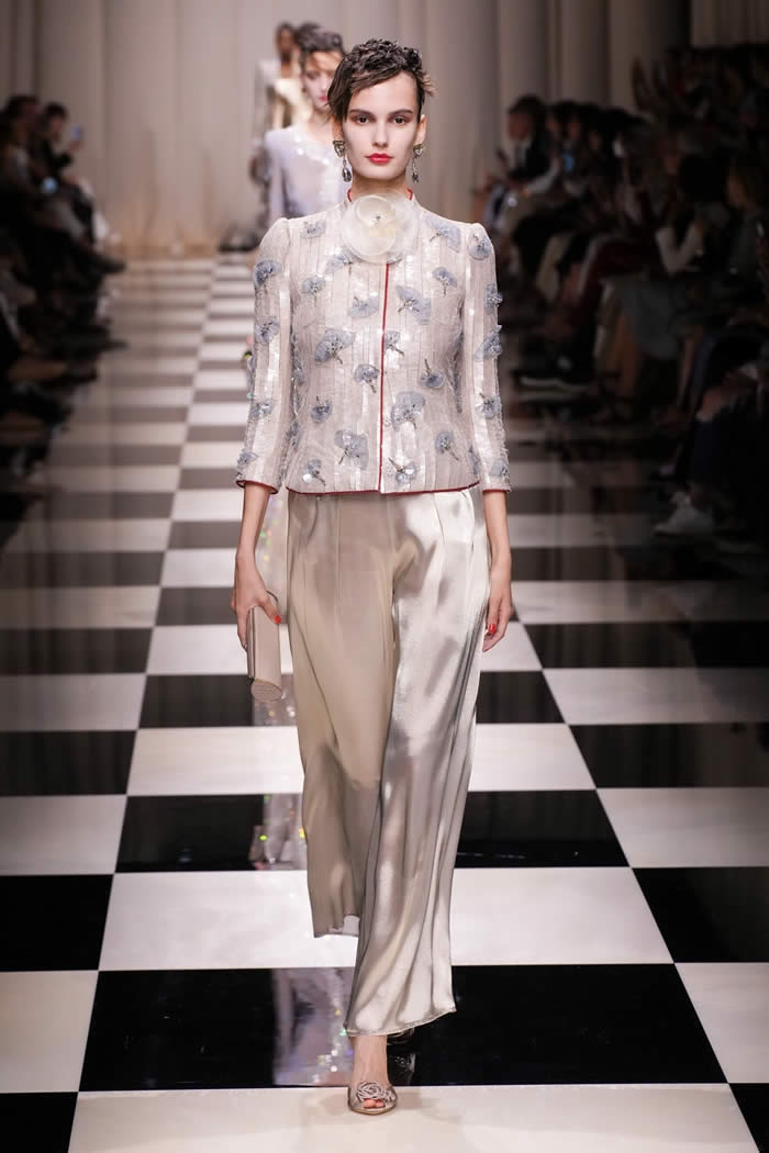 The runway came to life as models gracefully walked on a checkerboard surface, adorned in silky, tapered trousers paired with slim brocade jackets and exquisitely beaded shirts and tunics. While the couture season has witnessed a more subdued mood, Armani deviated from the norm, opting for lustrous fabrics, lavish embellishments, and an abundance of crystals and beadwork.