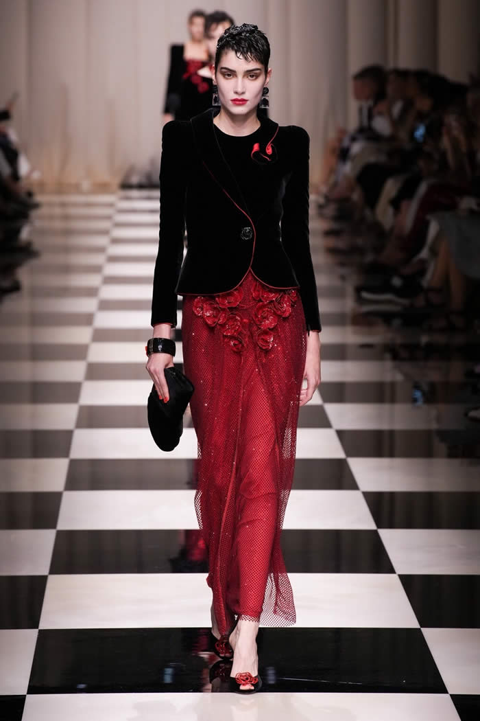 The presence of roses gradually intensified throughout the show, appearing as fabric flourishes on tailored ensembles and as alternatives to metal buckles or jewels on evening shoes. Eventually, the red flower motif took center stage, reminiscent of a recent Chanel collection heavily influenced by the camellia. Armani’s interpretation of the floral theme showcased 3D rose embellishments clustered on shoulders and scattered on flaring evening gowns.