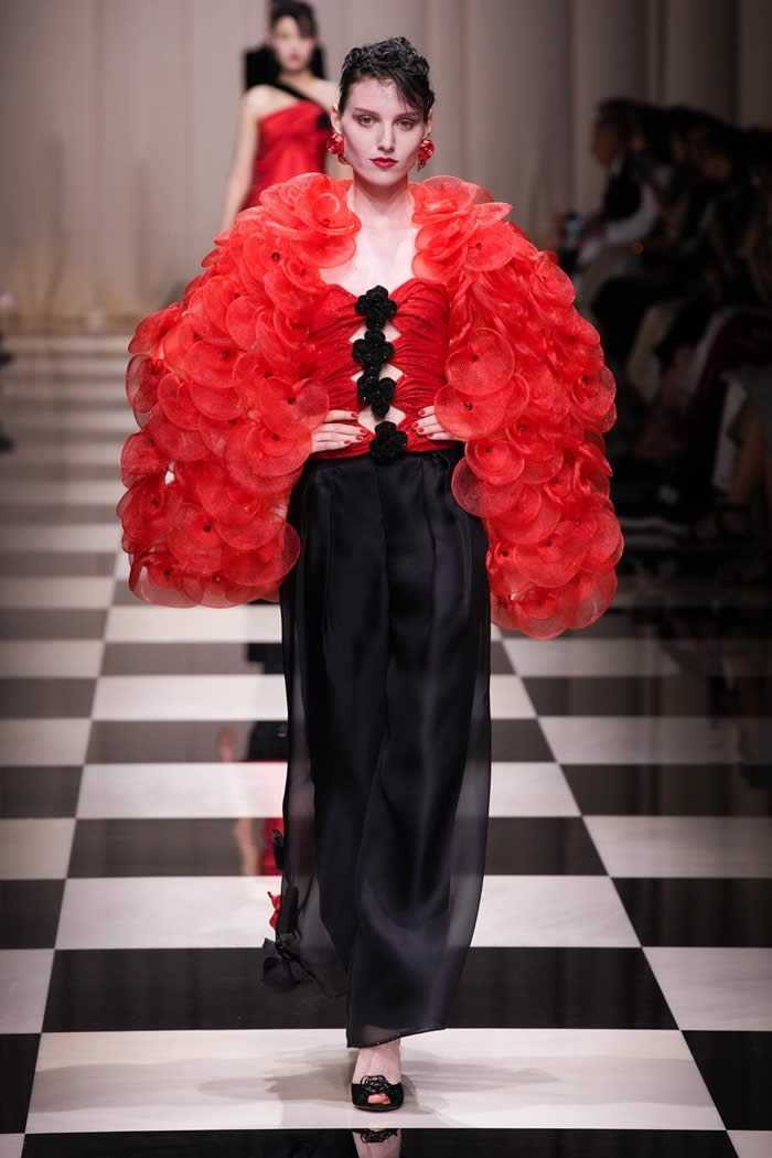 Giorgio Armani’s fall Privé couture show was a mesmerizing spectacle that drew inspiration from the beauty of roses and the allure of lacquer boxes from the Far East. From the moment guests received their glossy red invitations, the stage was set for a collection that perfectly showcased Armani’s signature style, blending opulence with meticulous craftsmanship.