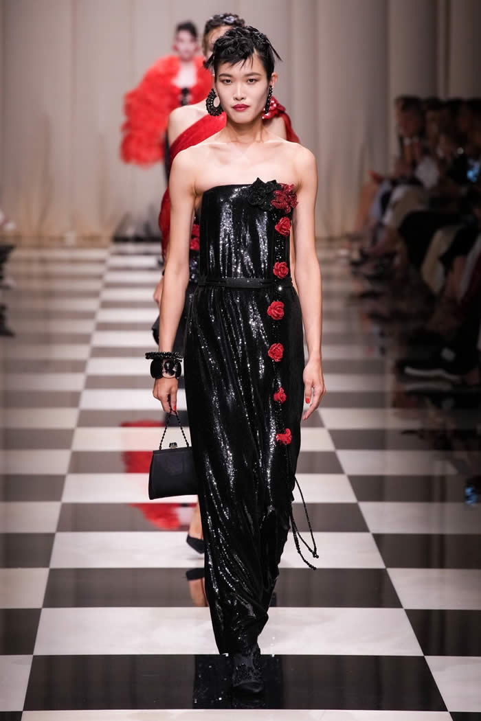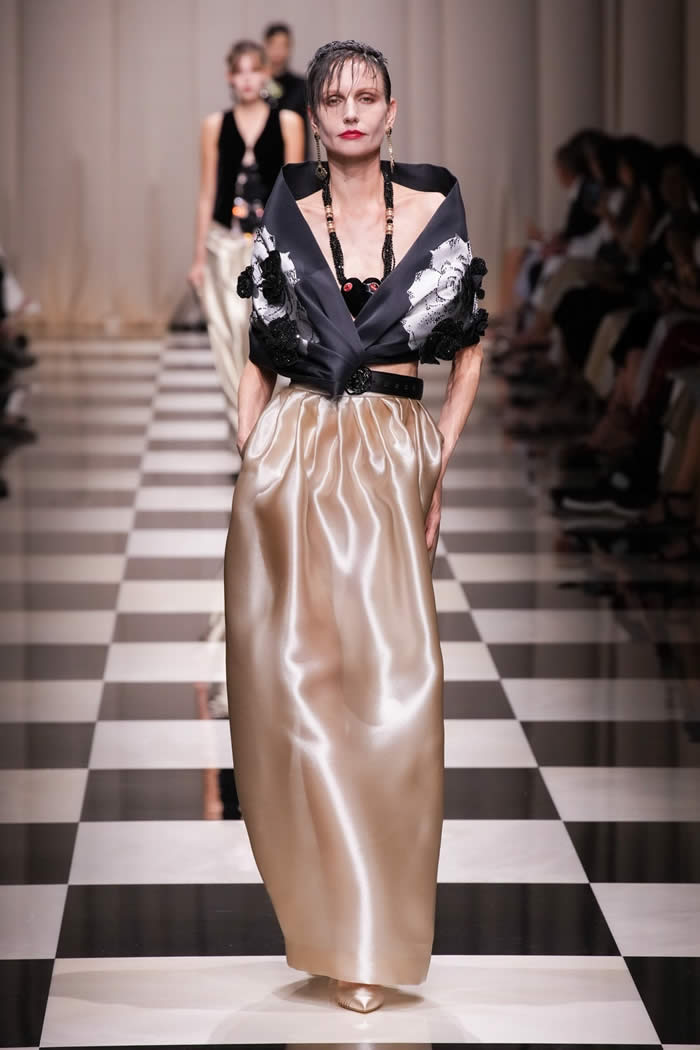 A rich color palette of black and gold dominated the collection, complemented by pagoda embroideries that evoked the imagery of intricate lacquered boxes. According to the press notes, the collection symbolized a journey from west to east, featuring elongated silhouettes infused with hints of other cultures and worlds.