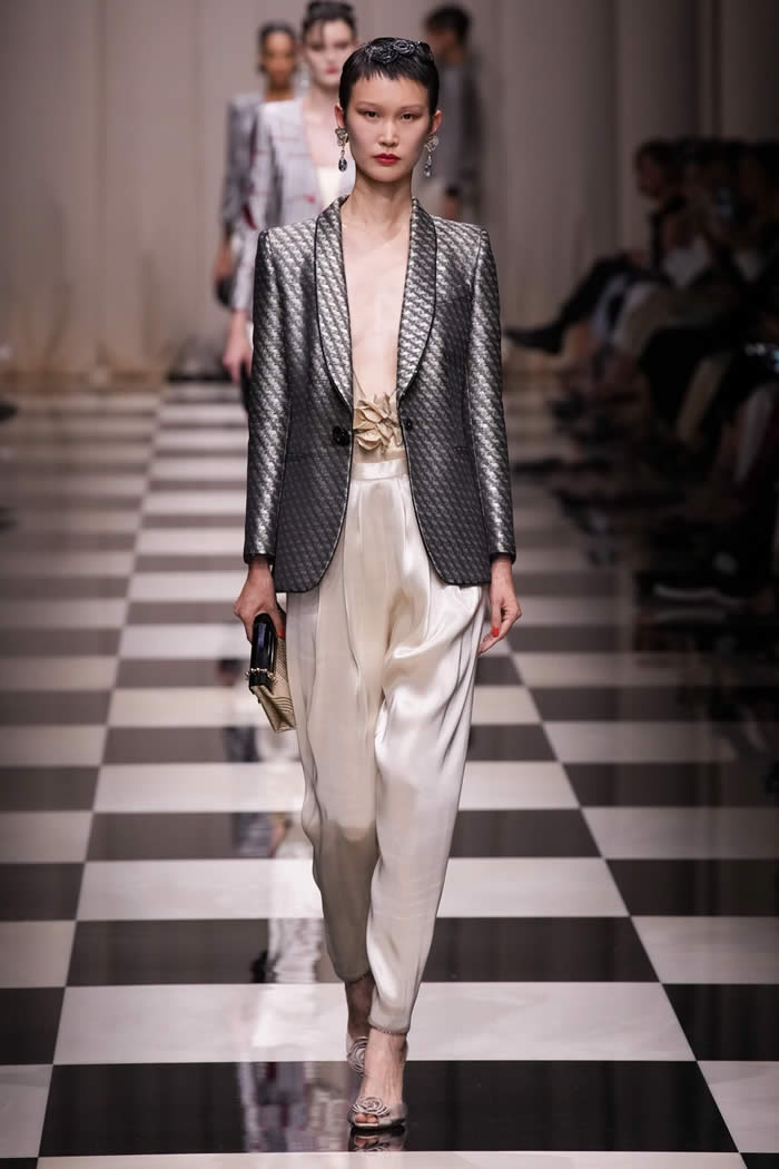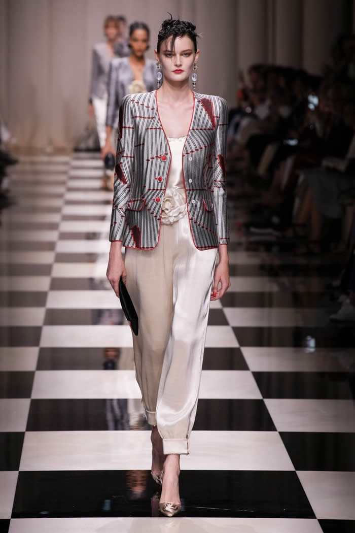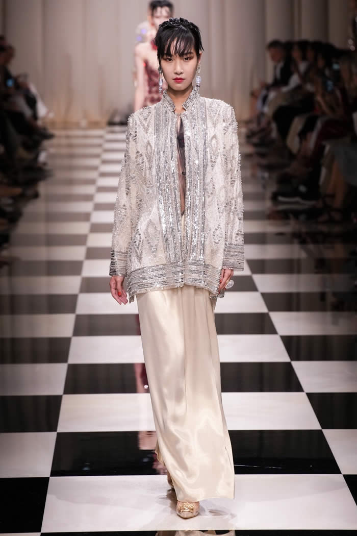 The runway came to life as models gracefully walked on a checkerboard surface, adorned in silky, tapered trousers paired with slim brocade jackets and exquisitely beaded shirts and tunics. While the couture season has witnessed a more subdued mood, Armani deviated from the norm, opting for lustrous fabrics, lavish embellishments, and an abundance of crystals and beadwork.