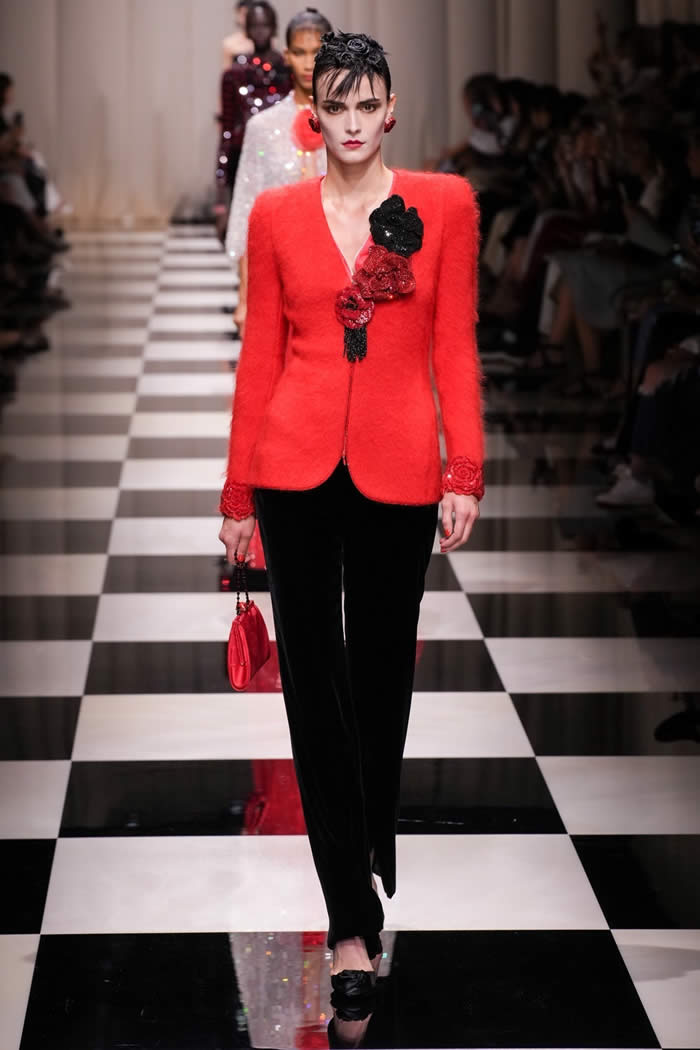 The presence of roses gradually intensified throughout the show, appearing as fabric flourishes on tailored ensembles and as alternatives to metal buckles or jewels on evening shoes. Eventually, the red flower motif took center stage, reminiscent of a recent Chanel collection heavily influenced by the camellia. Armani’s interpretation of the floral theme showcased 3D rose embellishments clustered on shoulders and scattered on flaring evening gowns.