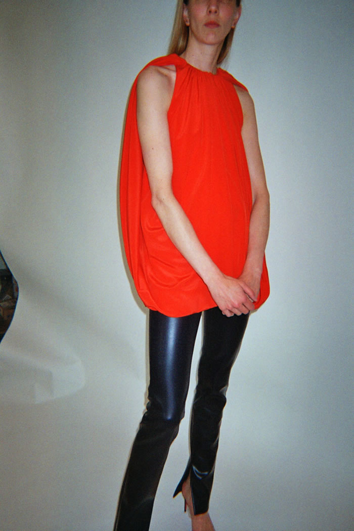 He layered an orange draped top over louche yet structured black pants and twisted his dresses and tops in an array of shades.