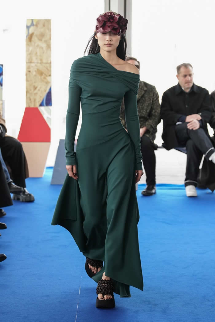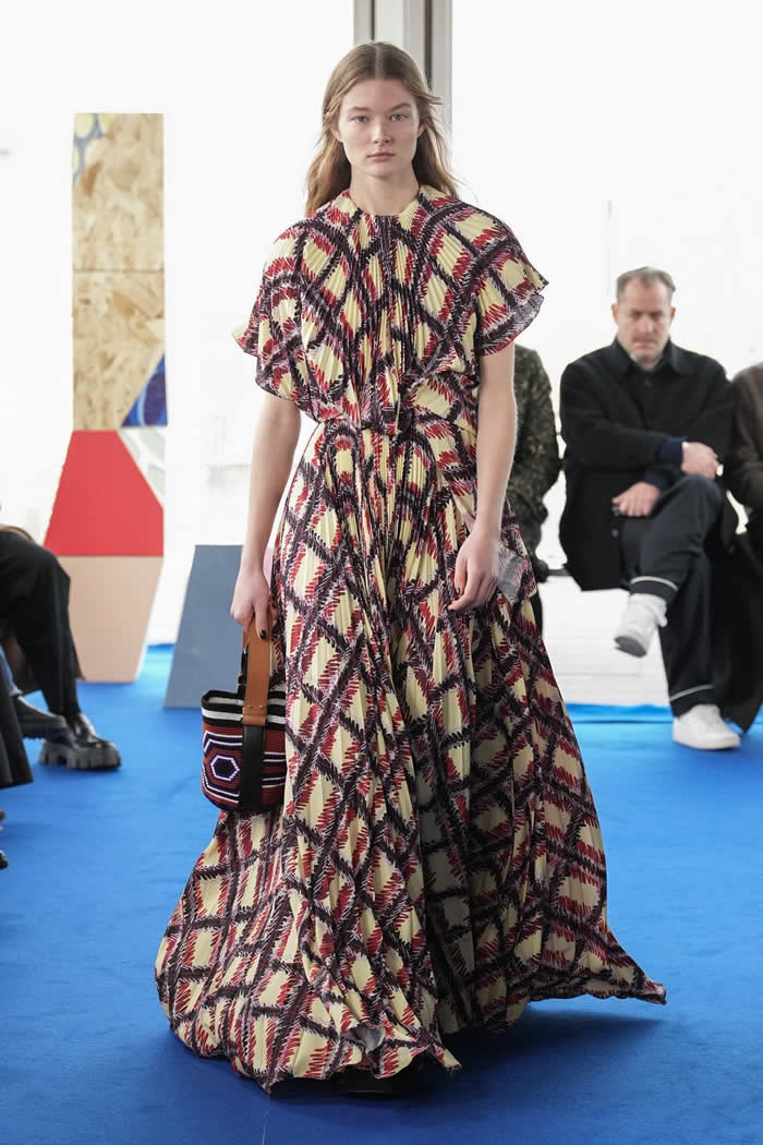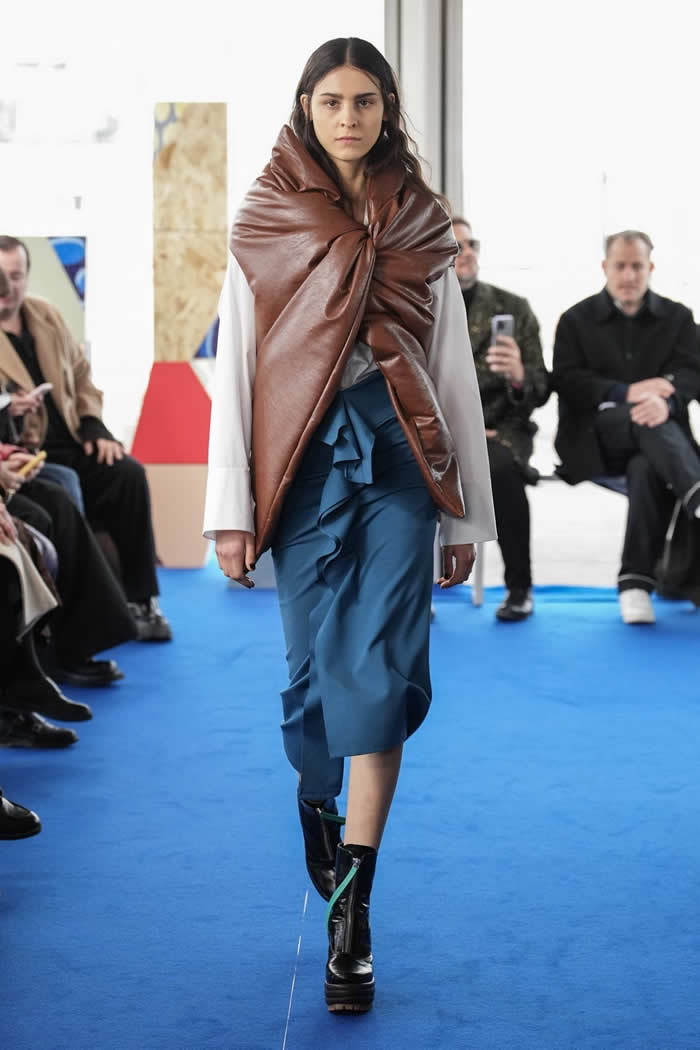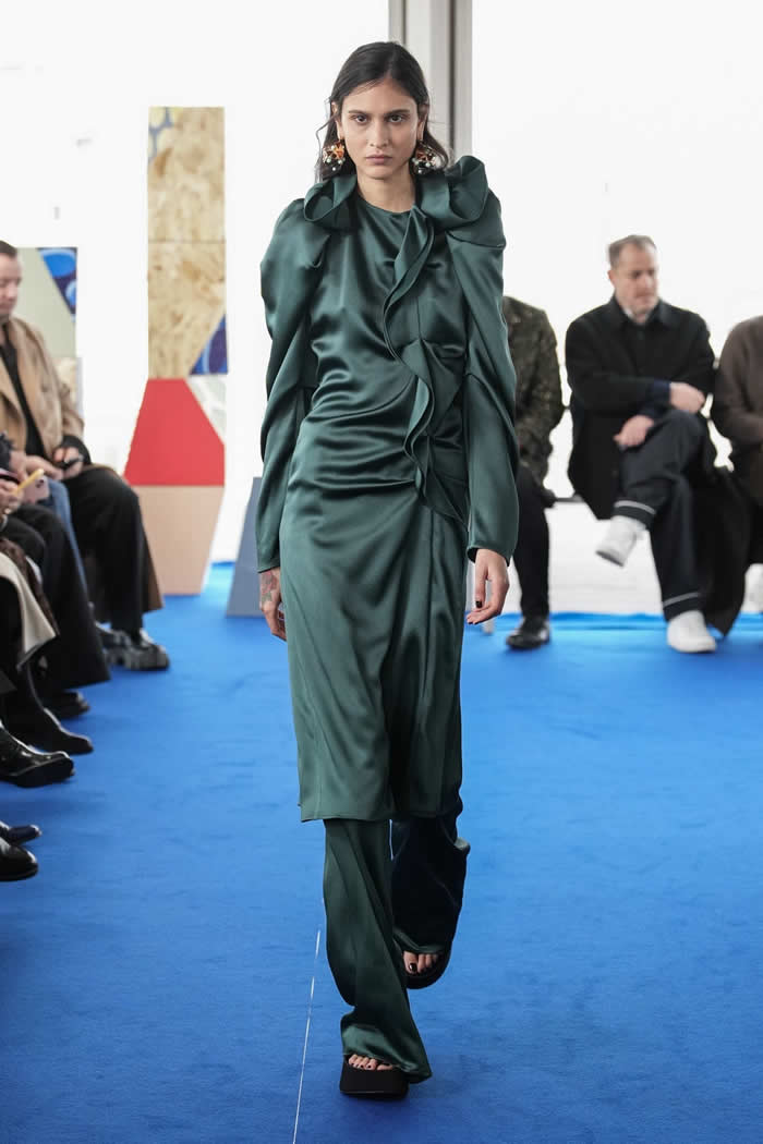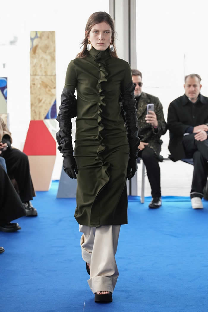 There we watched Colville’s grown-up, quirkily appealing style—their way with layering, wrapping, and prints—integrated with some of the signature techniques Elbaz practiced throughout his career. The first few looks exemplified Elbaz’s way of interpreting raw-edged frills, gathered vertically center-front in a dark olive jersey tunic, and a skirt and T-shirt in a petrol blue.