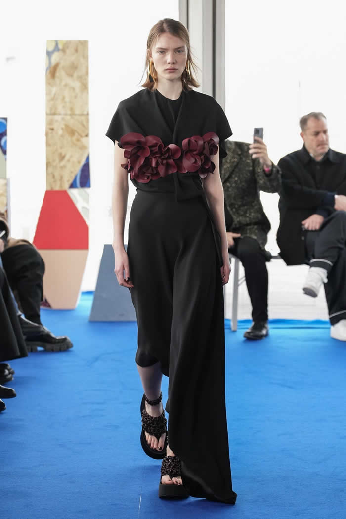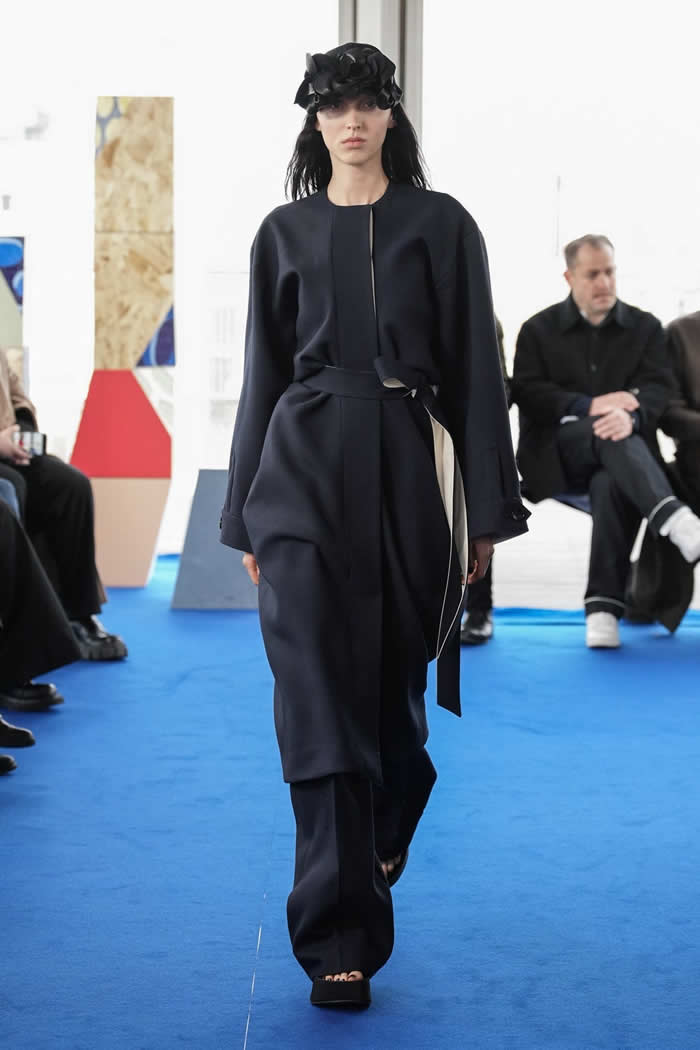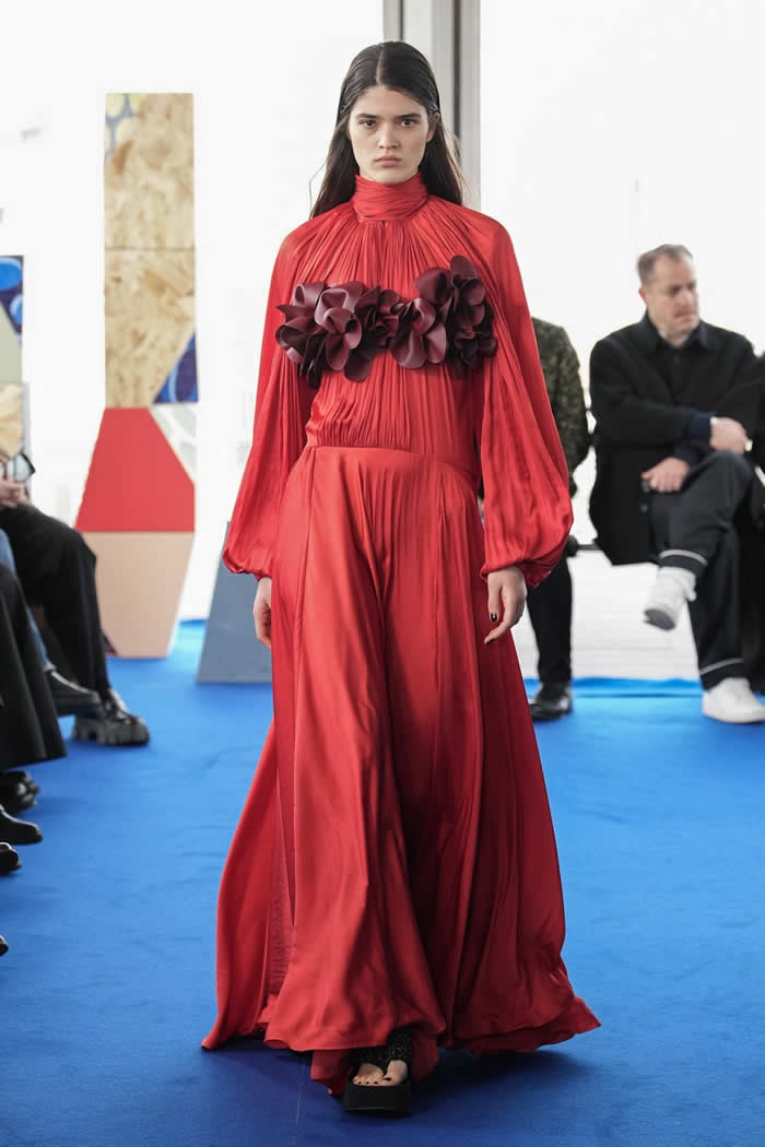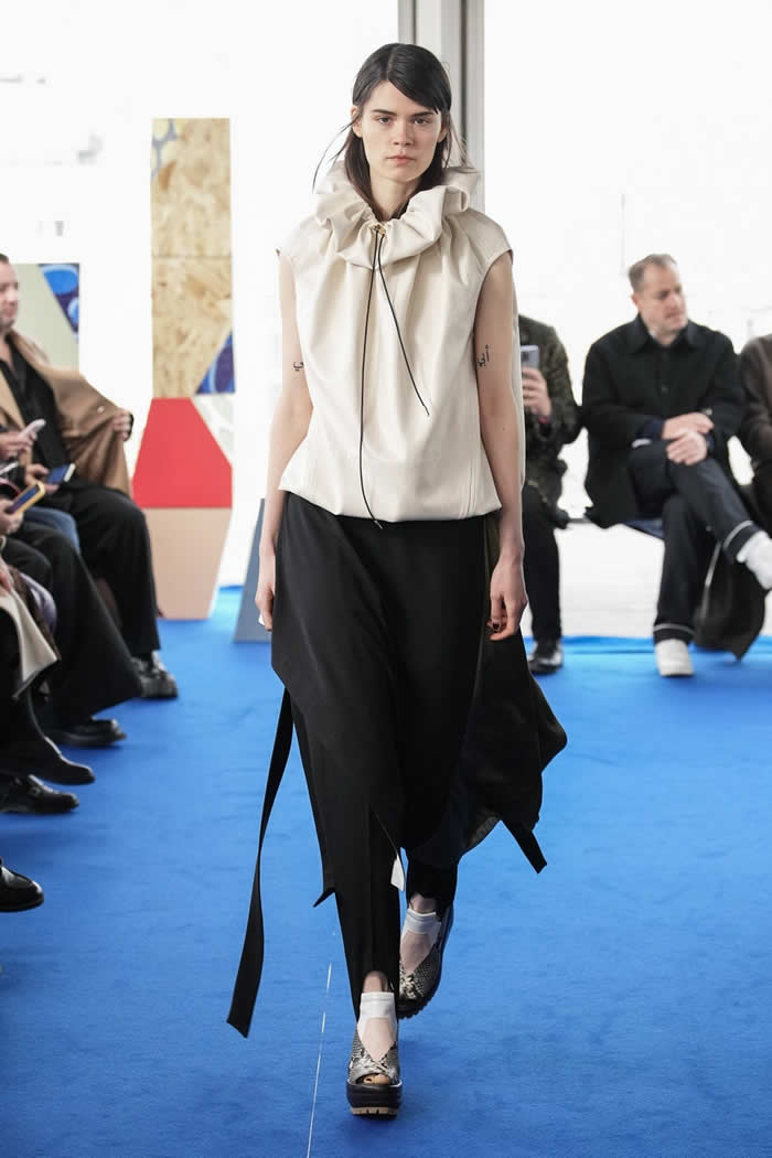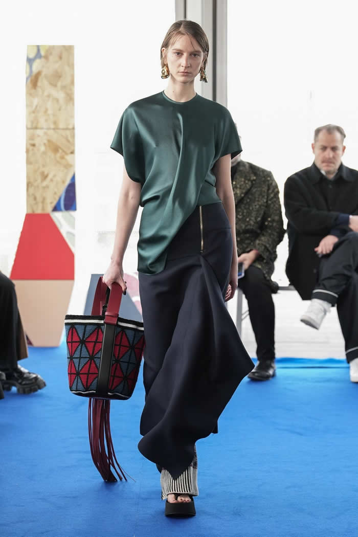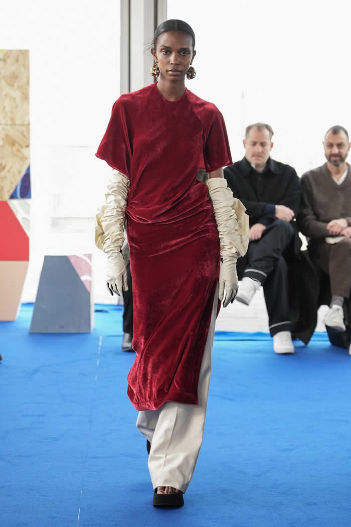 There we watched Colville’s grown-up, quirkily appealing style—their way with layering, wrapping, and prints—integrated with some of the signature techniques Elbaz practiced throughout his career. The first few looks exemplified Elbaz’s way of interpreting raw-edged frills, gathered vertically center-front in a dark olive jersey tunic, and a skirt and T-shirt in a petrol blue.
