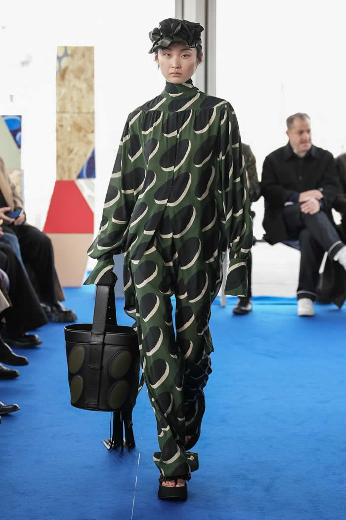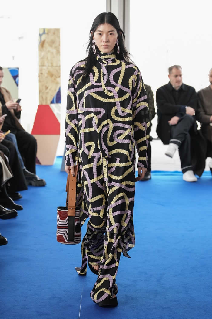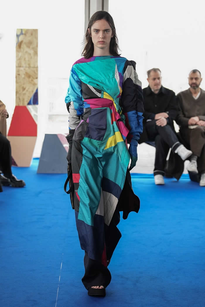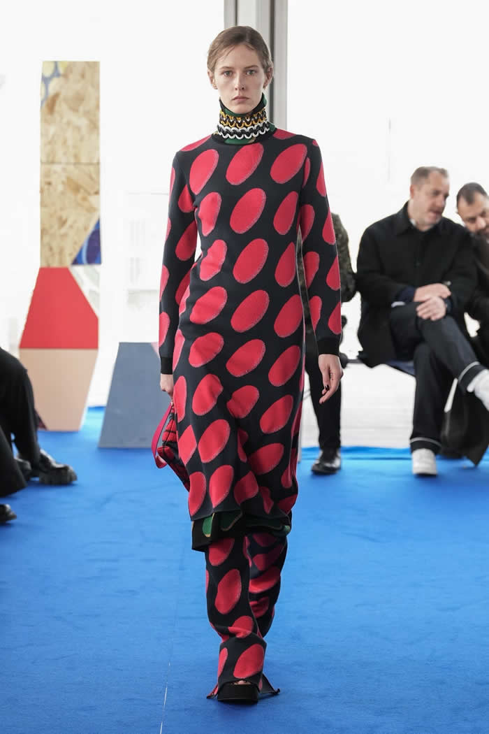 The Colville knack, recognizable from the presentations they usually put on during Milan Fashion Week, brings together a wardrobe of mixed-media sporty things, retro prints, flowy asymmetric dresses, and crafty accessories. Put together in layerings of slim dresses over pants, wiggle patterns, and dots translated over flowy pleats and jacquard coats it captured the personal, arty style that Colville exemplifies.