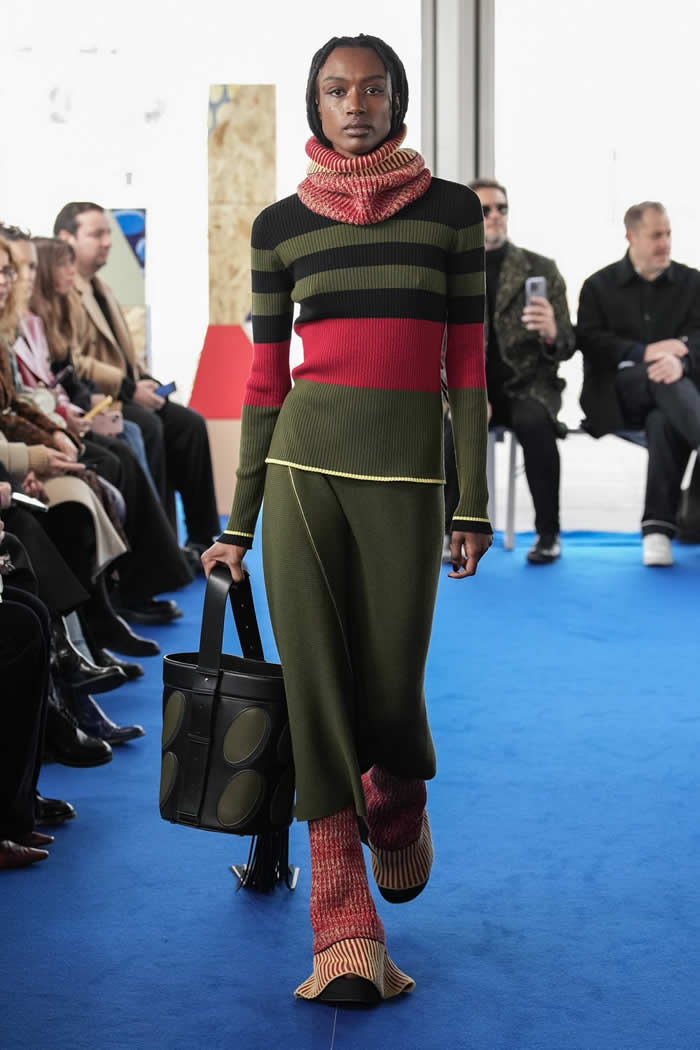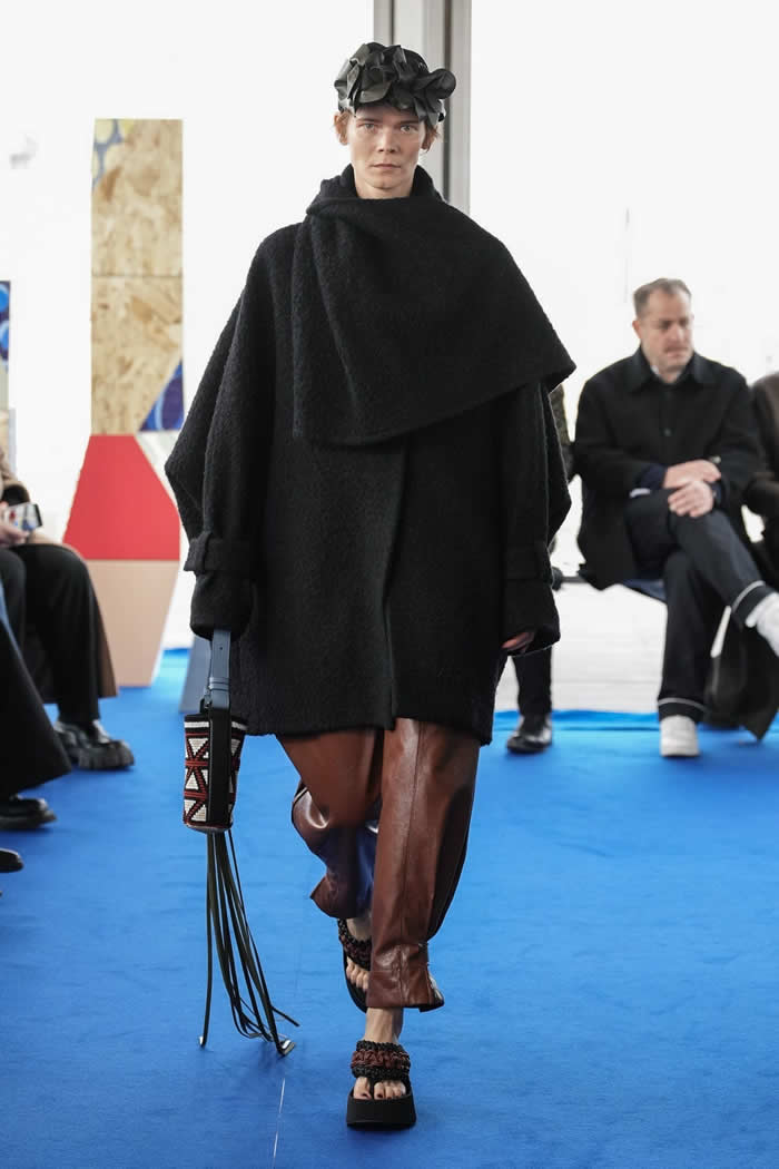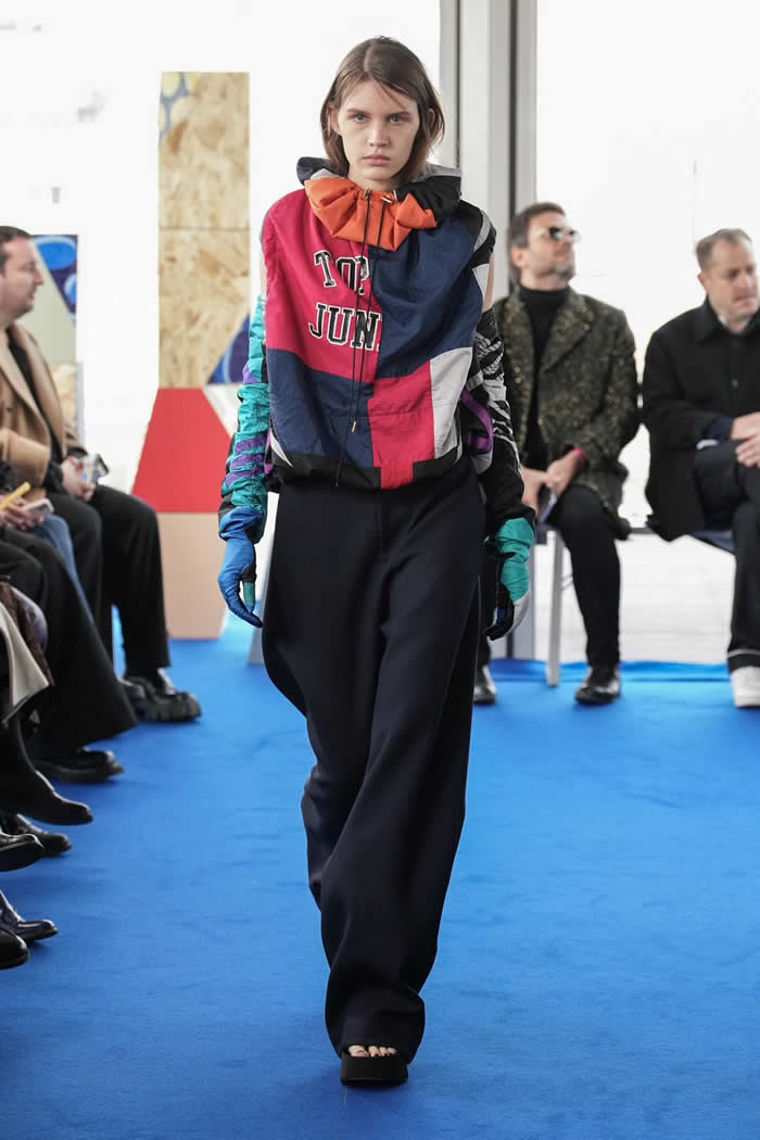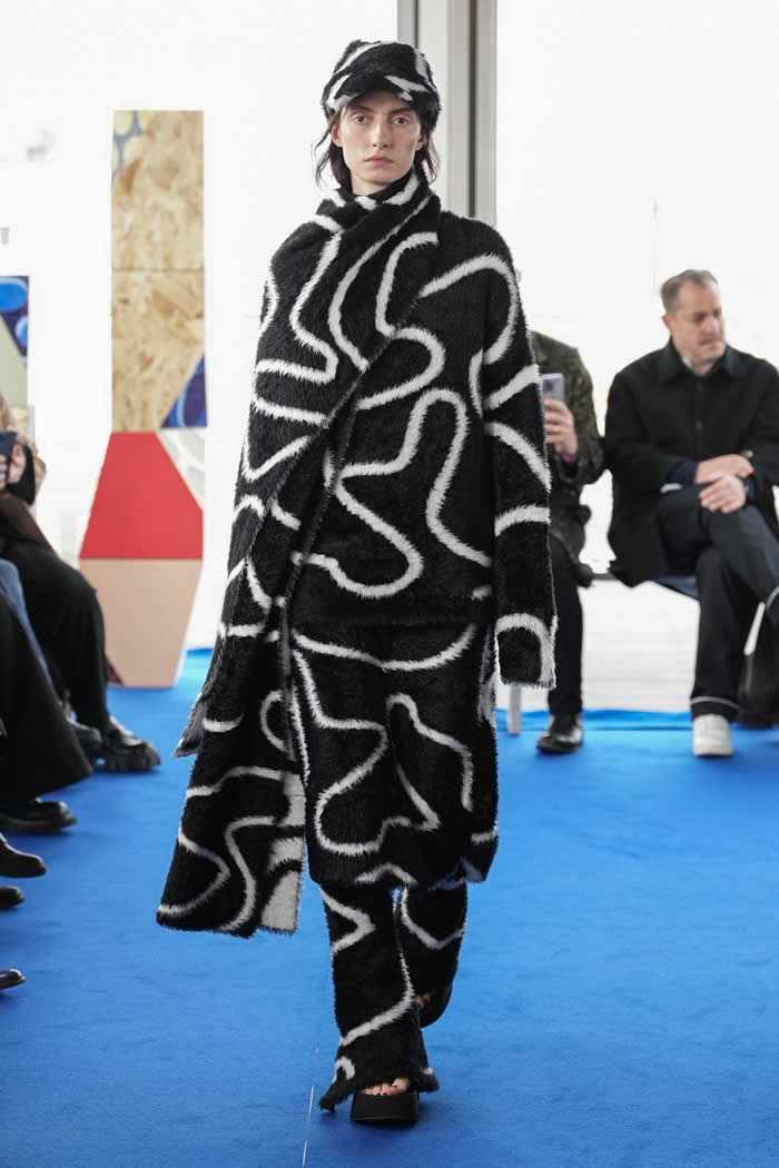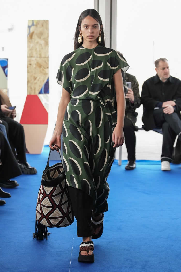 The Colville knack, recognizable from the presentations they usually put on during Milan Fashion Week, brings together a wardrobe of mixed-media sporty things, retro prints, flowy asymmetric dresses, and crafty accessories. Put together in layerings of slim dresses over pants, wiggle patterns, and dots translated over flowy pleats and jacquard coats it captured the personal, arty style that Colville exemplifies.