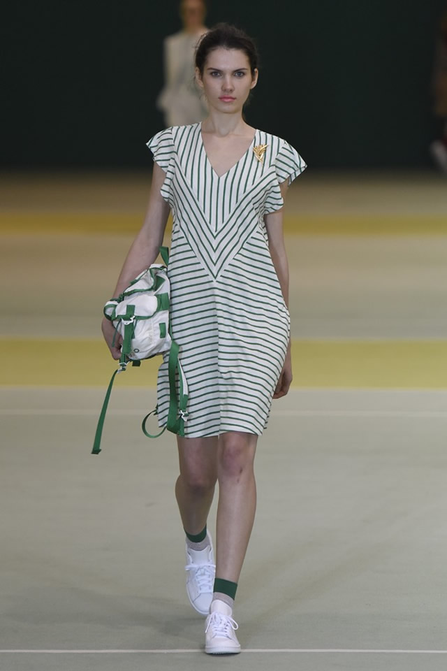 The sporting theme didn’t end there. Kumakiri opened with literal representations of tennis garb before moving on to more versatile looks that would be at home in any country club. These included skirts, unisex pullovers and men’s shorts in a mix of contrasting stripes. A women’s denim cropped top modeled after a pair of overalls had a youthful vibe, while a cartoonlike iguana added a touch of humor to a men’s sweater.