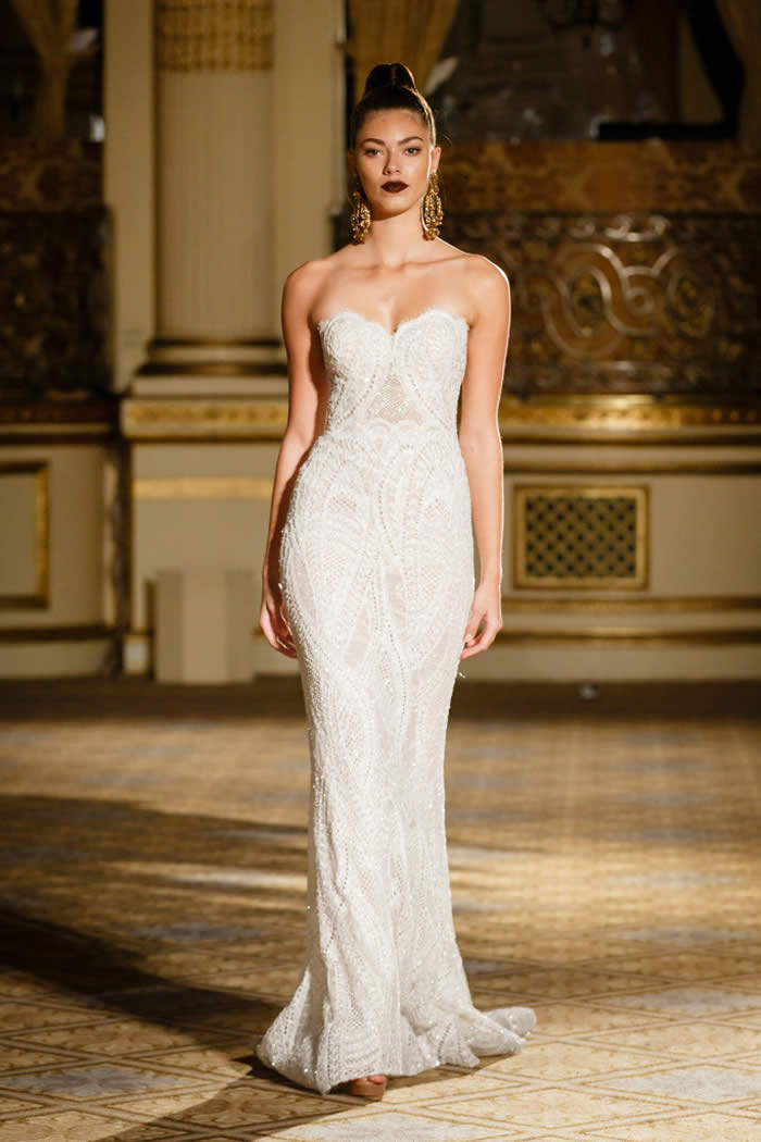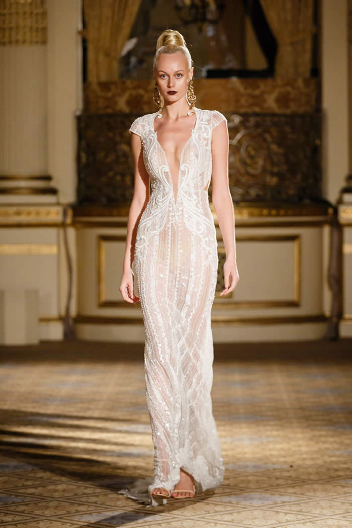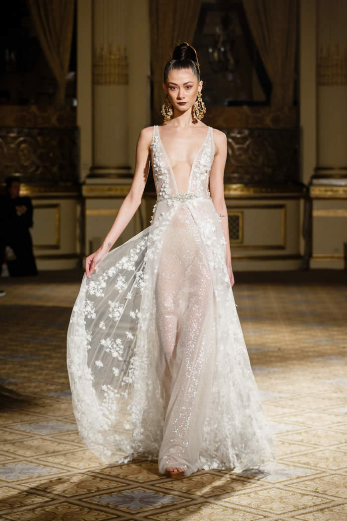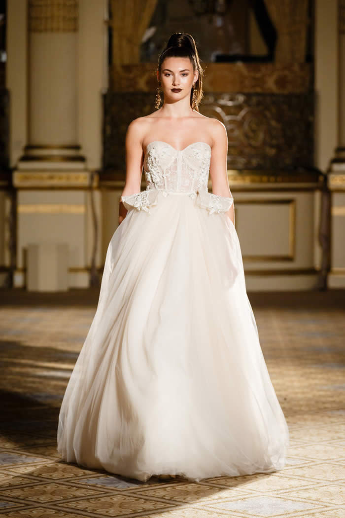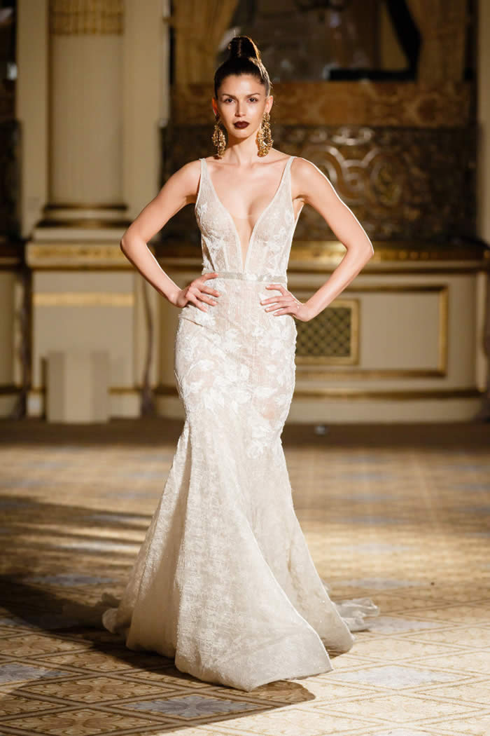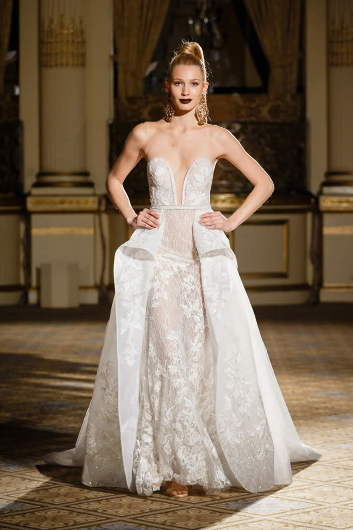 Berta Balilti presented a glamorous collection that proves quite literally that a bride deserves to shine on her wedding day. Berta’s strongest points from her hand embellished lineup included a plunging V-neck dress with 3-D lace flowers, middle slit with sparkling underlay and open back, and an illusion strapless dress with lace embroidery, open back and optional lace embroidered overskirt.
