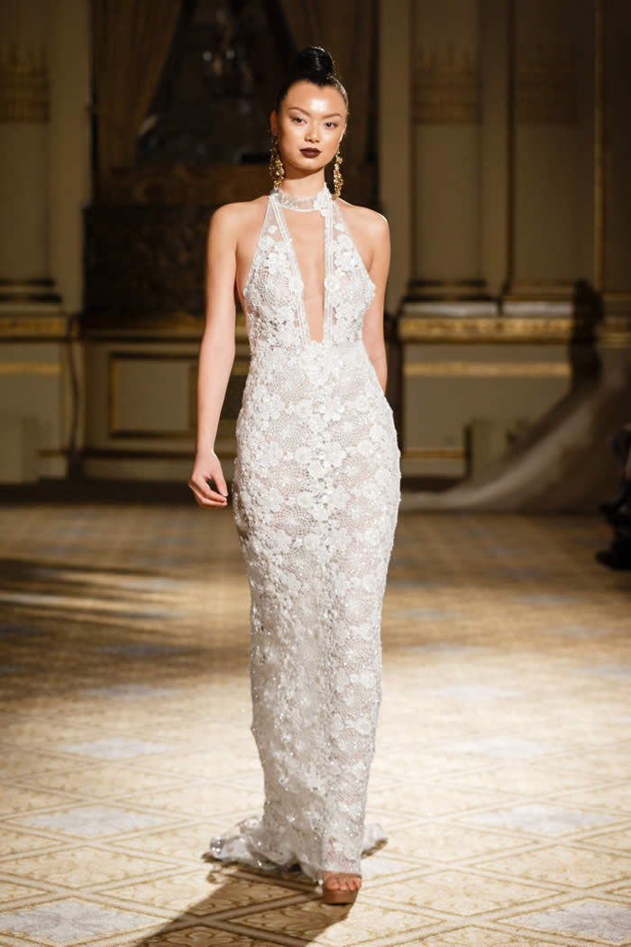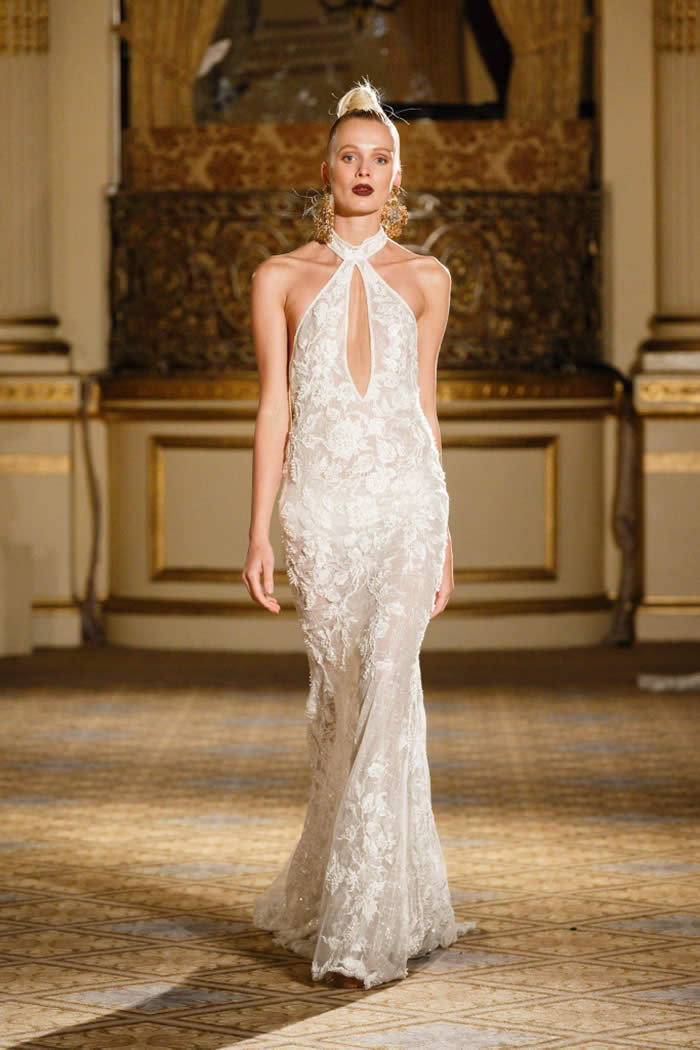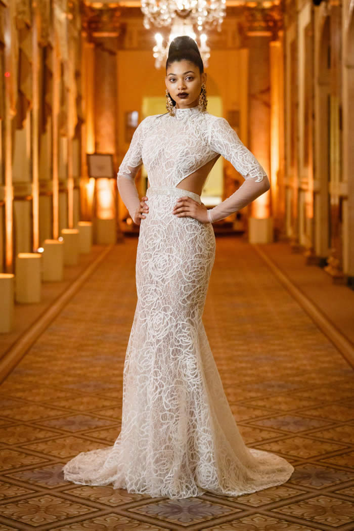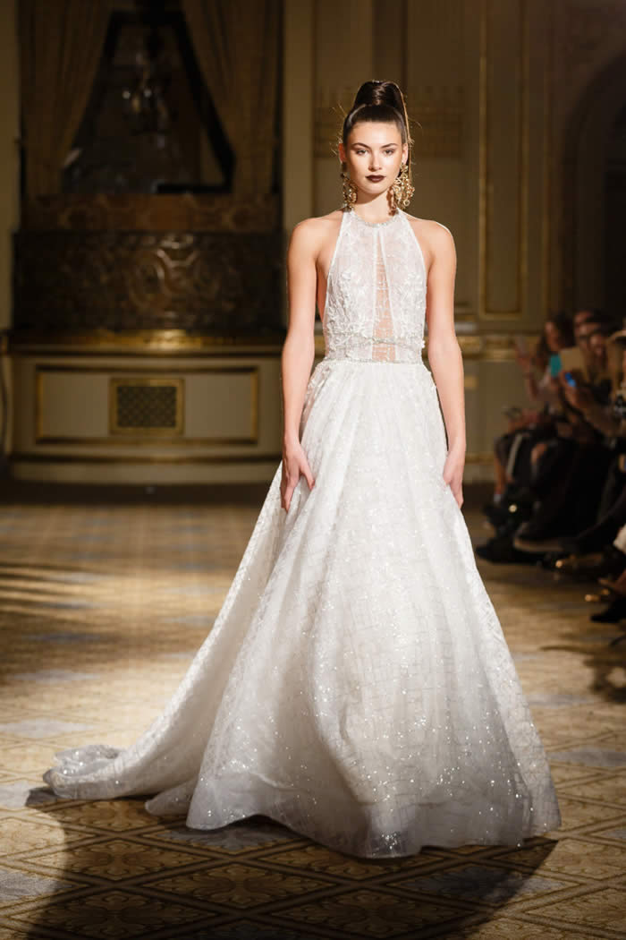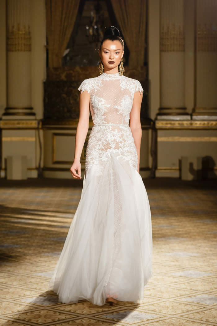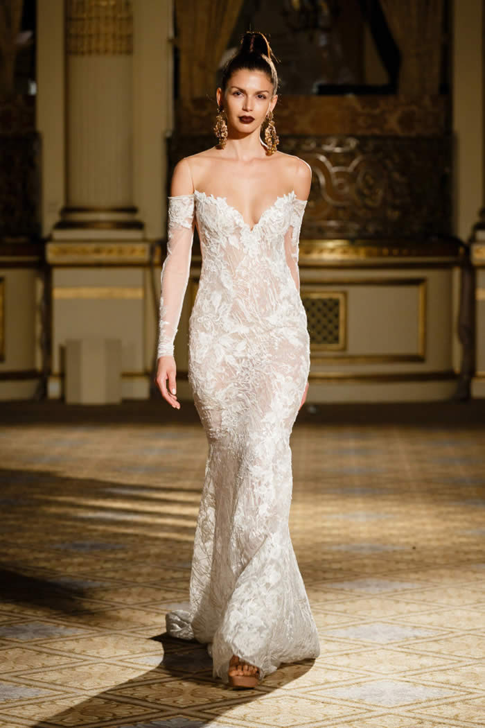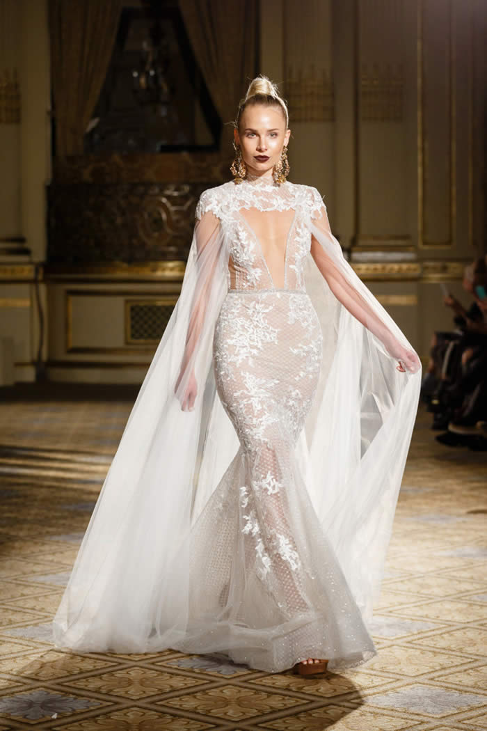 Berta Balilti presented a glamorous collection that proves quite literally that a bride deserves to shine on her wedding day. Berta’s strongest points from her hand embellished lineup included a plunging V-neck dress with 3-D lace flowers, middle slit with sparkling underlay and open back, and an illusion strapless dress with lace embroidery, open back and optional lace embroidered overskirt.