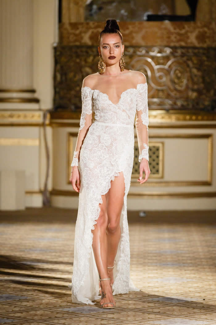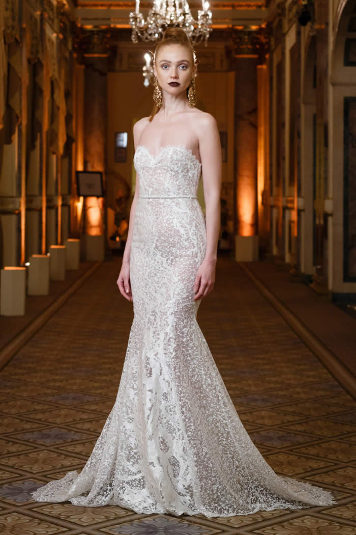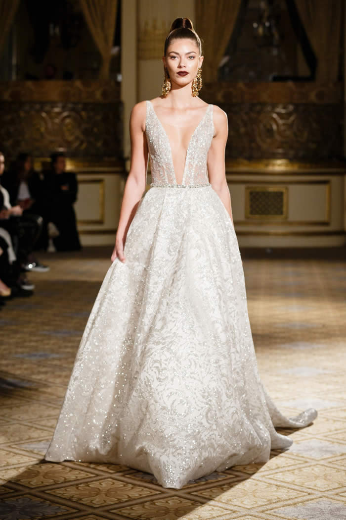 Berta Balilti presented a glamorous collection that proves quite literally that a bride deserves to shine on her wedding day. Berta’s strongest points from her hand embellished lineup included a plunging V-neck dress with 3-D lace flowers, middle slit with sparkling underlay and open back, and an illusion strapless dress with lace embroidery, open back and optional lace embroidered overskirt.