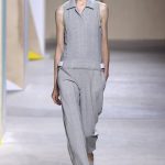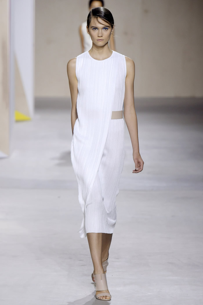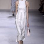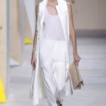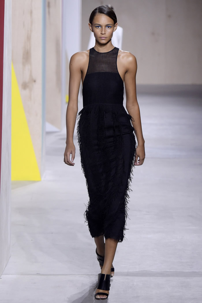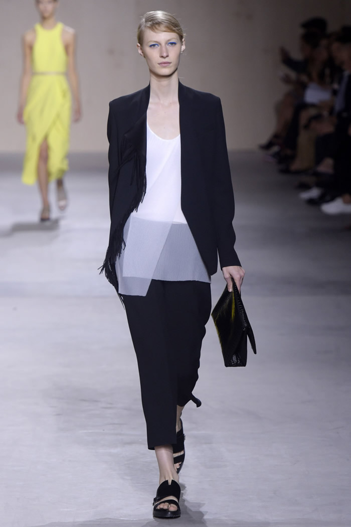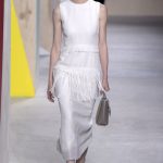 More classic takes on tailoring included clean, loosely structured jackets and cropped wide trousers that felt fresh in stark white. A few jackets, long vests and sporty slim dresses were trimmed in fringe, a detail that is offering a chic solution to decorative banality in a lot of collections right now. Along the way, square, structured top-handle bags in multicolored geometric patterns contrasted the bright, clinical hues with a touch of craftiness.