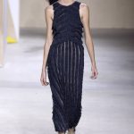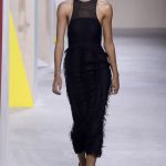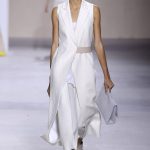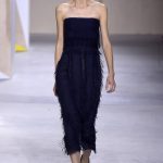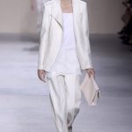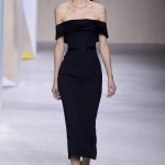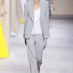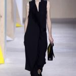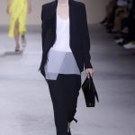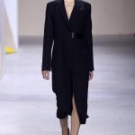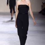 The show ended on a resolutely chic note with three riffs on traditional black tailored suits turned sensual and modern: a lean off-the-shoulder dress, a strapless jumpsuit with a sleek fold-over take on a satin lapel and a plain black jacket. No nonsense. Boss hired Wu to infuse its pragmatic focus with glamour and he’s proving to be the man for the job.