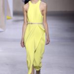 He delivered on that premise with two crisp, white shirtdresses, one in a spare, wrap construction, the other spliced with airy panels of sheer technical organza. This fabric was a great tool for giving breathing room and modern movement to sharp shirts and structured shift dresses. Wu also used the technical organza on bright wrap dresses in yellow, blue and rust that displayed a minimalist femininity.