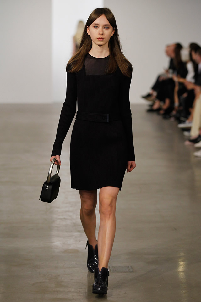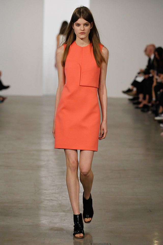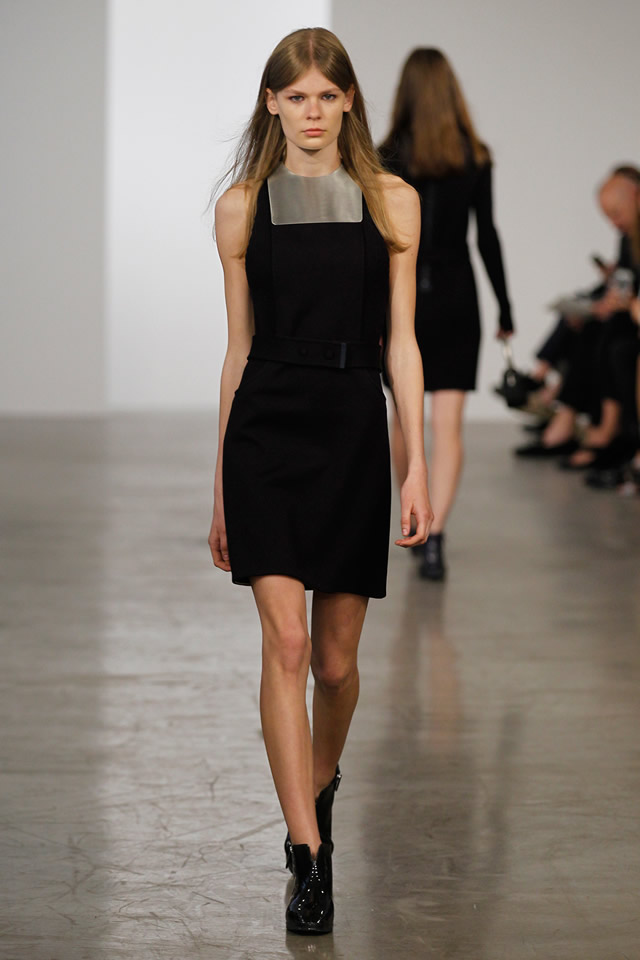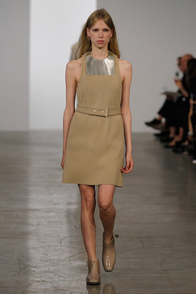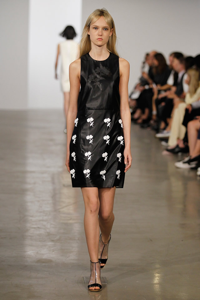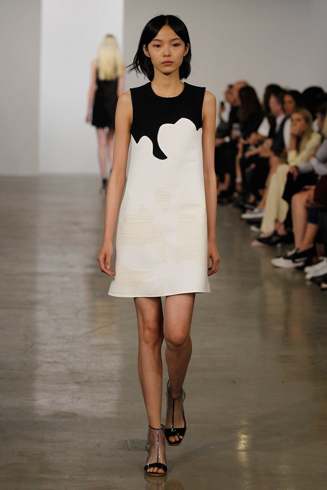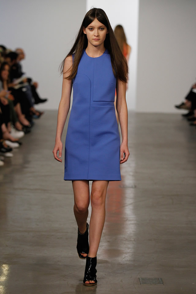 Resort marks a timely reversal for Calvin Klein Collection. After two seasons of cozy, even crafty shows, designer Francisco Costa has embraced a more linear, streamlined silhouette. Backstage afterward, he claimed Matisse’s collages as an inspiration. "Fall was very organic; it was time to offer women something else," he said. That something else boiled down to a vaguely late sixties, early seventies silhouette-sleeveless A-line dresses, cropped zip-front jackets, and flares chopped off above the ankle, their retro associations heightened by the see-through plastic Chelsea boots with which they were paired. Brushed-metal bibs built into some of the shifts added to the space-age vibes. Where last season’s materials were furry or fuzzy, Costa’s technical fabrics for Resort were flat, exuding a modern cool. The palette was equally precise in shades of black, white, blue, and sand. Curving plastic zips inset at the hips were among the collection’s few embellishments, save for the flat Lucite flowers embroidered with grid-like rigor on the hem of two dresses at the end.