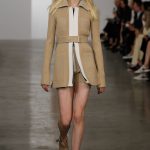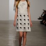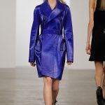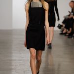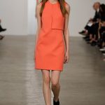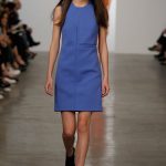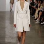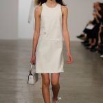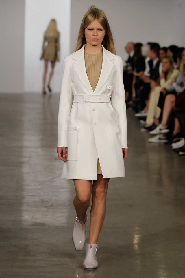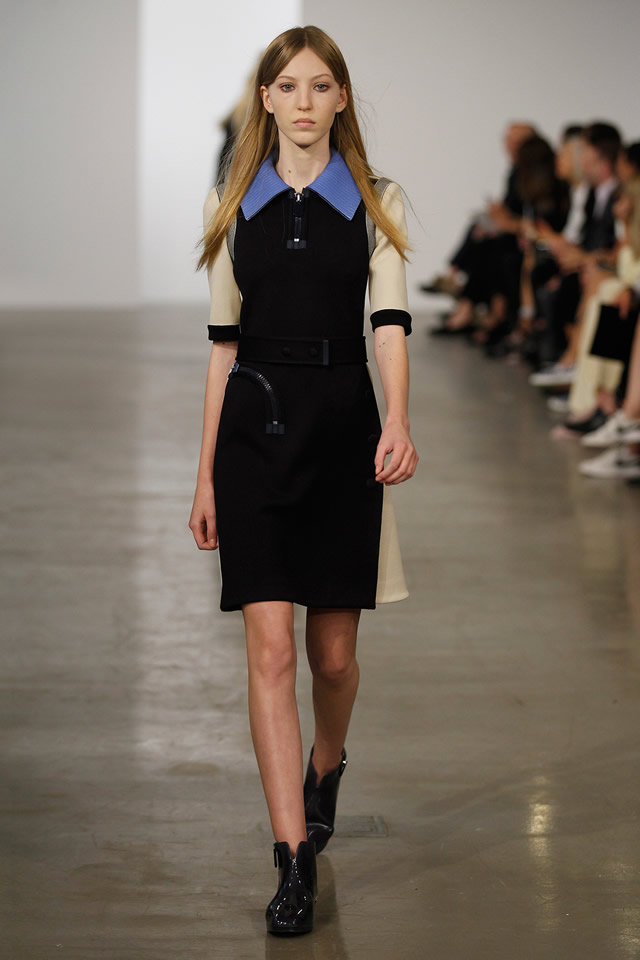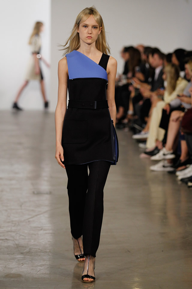 Resort marks a timely reversal for Calvin Klein Collection. After two seasons of cozy, even crafty shows, designer Francisco Costa has embraced a more linear, streamlined silhouette. Backstage afterward, he claimed Matisse’s collages as an inspiration. "Fall was very organic; it was time to offer women something else," he said. That something else boiled down to a vaguely late sixties, early seventies silhouette-sleeveless A-line dresses, cropped zip-front jackets, and flares chopped off above the ankle, their retro associations heightened by the see-through plastic Chelsea boots with which they were paired. Brushed-metal bibs built into some of the shifts added to the space-age vibes. Where last season’s materials were furry or fuzzy, Costa’s technical fabrics for Resort were flat, exuding a modern cool. The palette was equally precise in shades of black, white, blue, and sand. Curving plastic zips inset at the hips were among the collection’s few embellishments, save for the flat Lucite flowers embroidered with grid-like rigor on the hem of two dresses at the end.