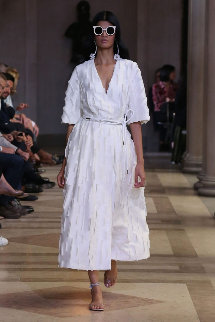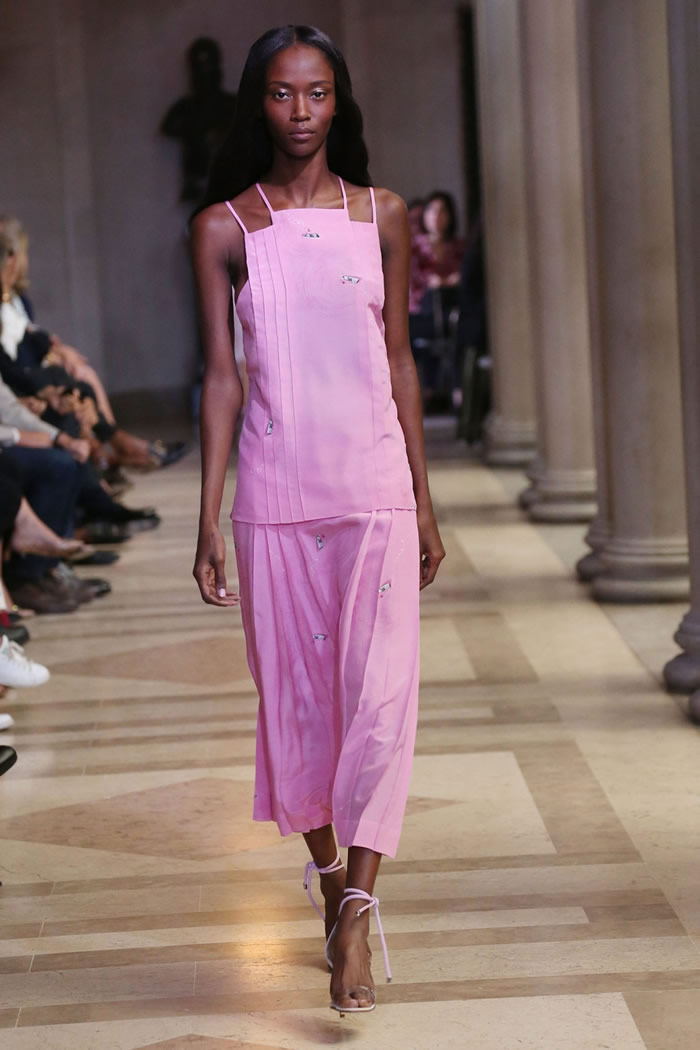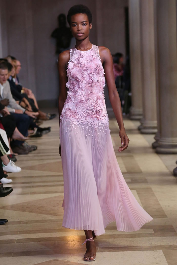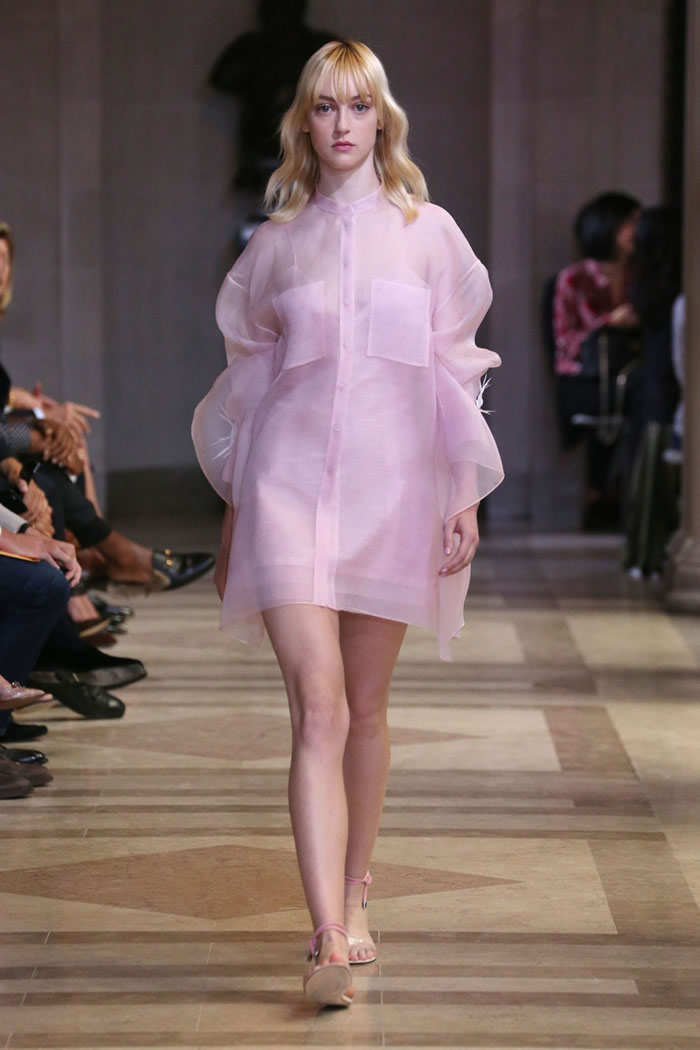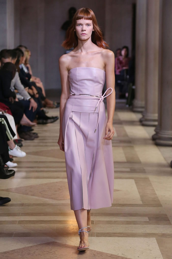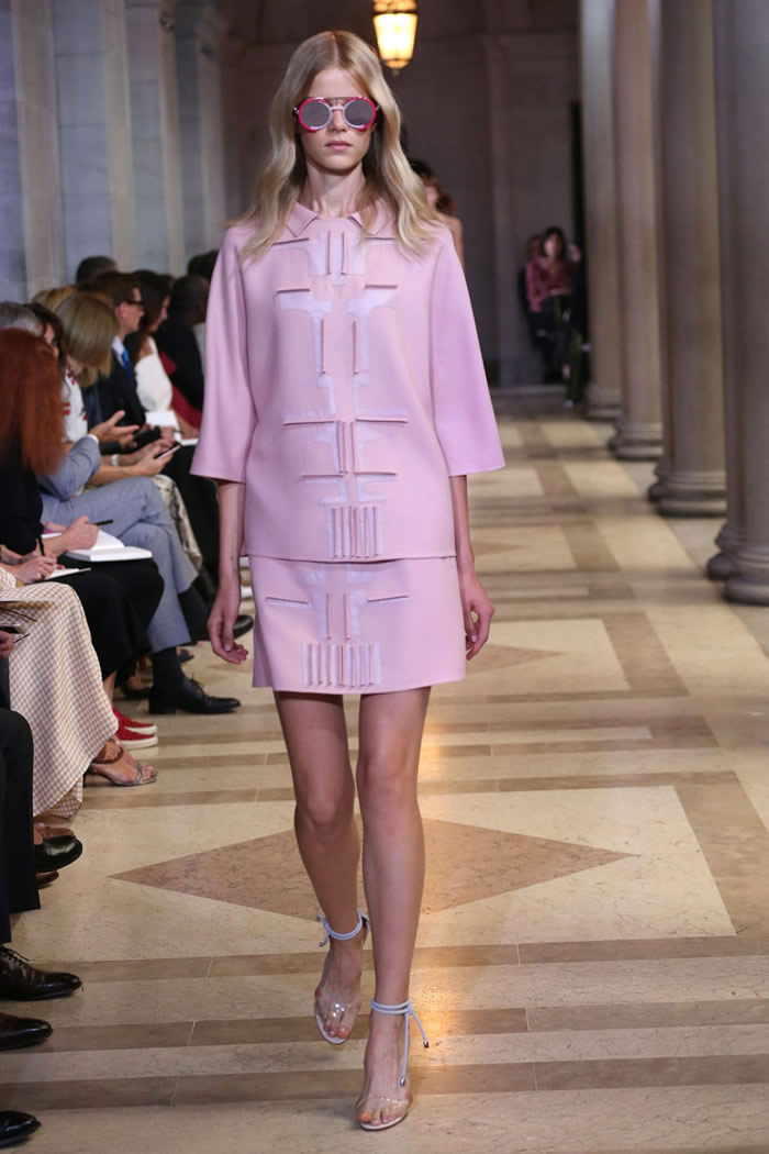 Within its hyper focus, this collection offered plenty of range. Dresses came as sheath, trapeze, shirtdress; evening, in two-piece ballgowns and a pleated white beauty with an overall top. As for all the pink, by keeping the decorative elements to the inherent structural geometry (save for the occasional feather and flower-appliqué sighting) it never over-blossomed into cloying sweetness. Rather, it played as sophisticated, optimistic chic.