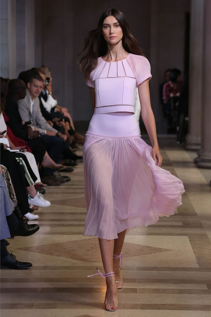 Within its hyper focus, this collection offered plenty of range. Dresses came as sheath, trapeze, shirtdress; evening, in two-piece ballgowns and a pleated white beauty with an overall top. As for all the pink, by keeping the decorative elements to the inherent structural geometry (save for the occasional feather and flower-appliqué sighting) it never over-blossomed into cloying sweetness. Rather, it played as sophisticated, optimistic chic.