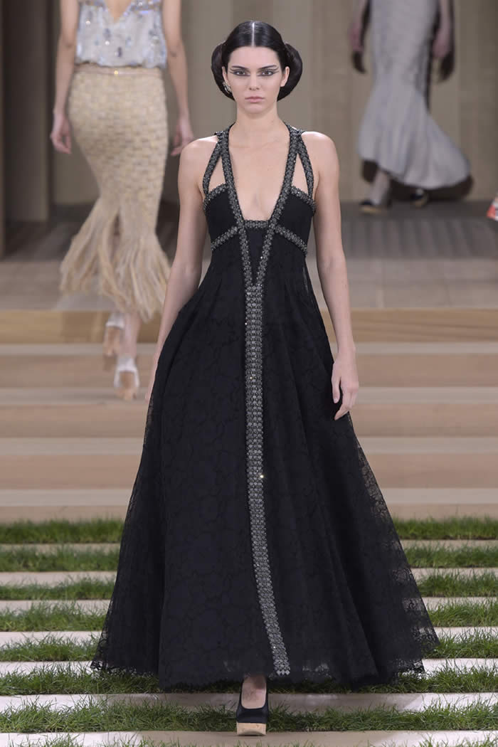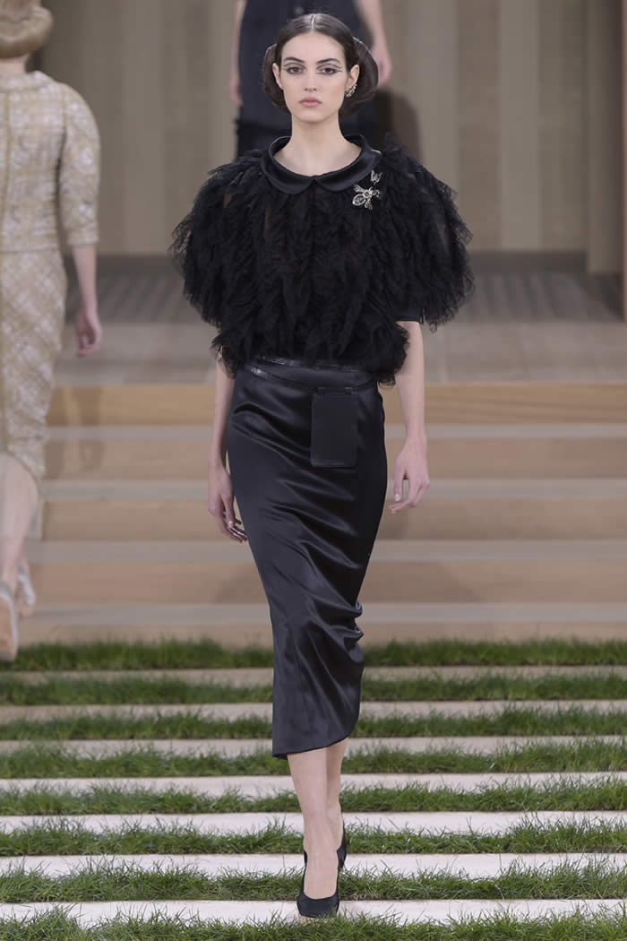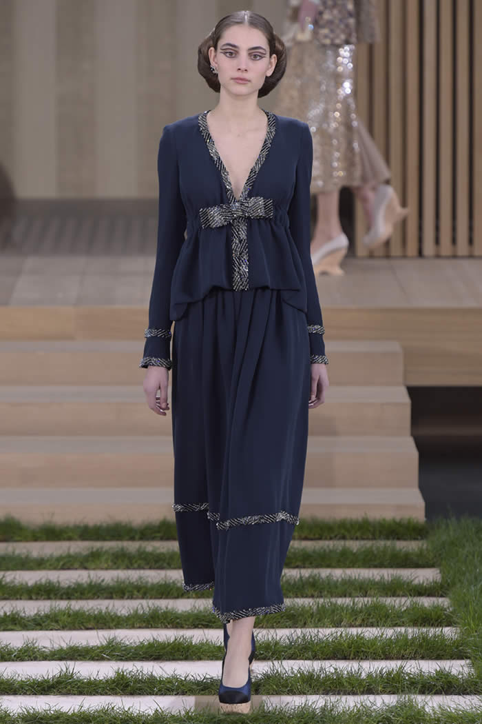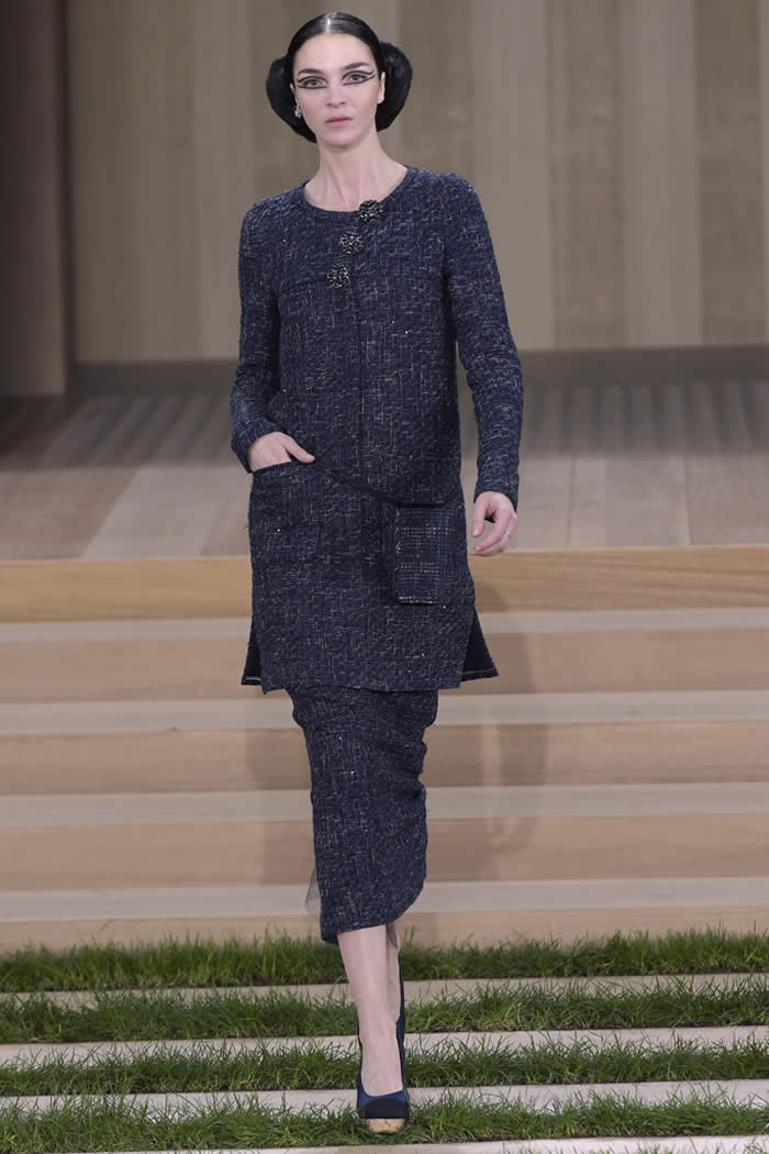 Those slits spoke to Lagerfeld’s creative ethos. Again and again, this consummate commercial designer delivers the highest of high fashion designed to be worn. The work is intense but not superfluous, delivered with a range essential to the house’s extensive clientele. For every rich lady who likes a suit on the plain side, such as the show opener with bold seaming its primary decoration, there’s another who fancies fancier. For her: the wooden embroideries, some natural in earnest, others integrating the kind of sparkle that only appears naturally in the night sky.