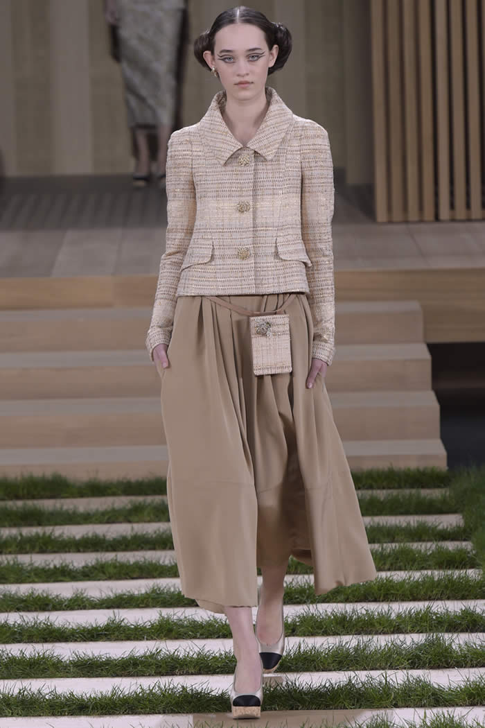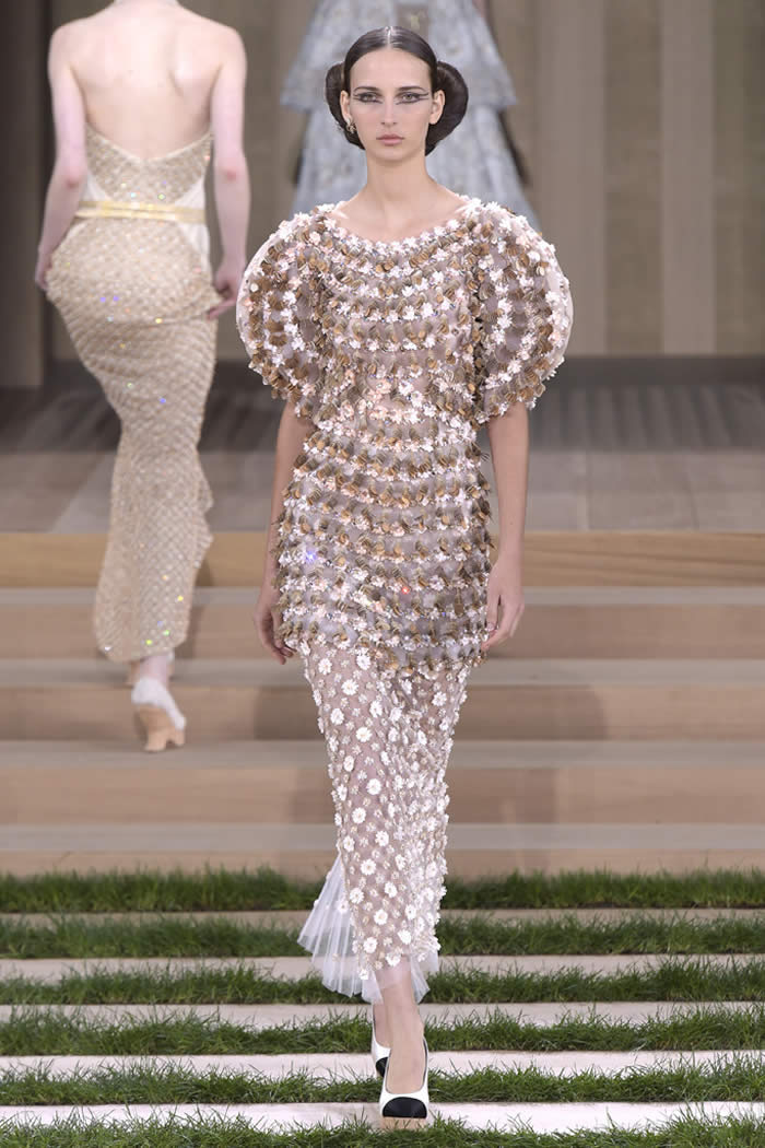 For spring, the ruse was ecological, au naturale. Hence, the base of beige (before she championed the LBD, Mademoiselle Chanel was known as the Queen of Beige, Lagerfeld informed during a studio visit) and the primary embroideries: wood. Every imaginable incarnation of wood-in-miniature became the stuff of couture craft flat, rounded, rough-hewn, smooth. So, too, did other materials string, straw, raffia, twine and what appeared to be raw cottons and linens, all transformed into embroidered tweeds, lattices and inventive embellishment. “It helps to own the houses,” Lagerfeld said, referring to the network of specialty ateliers Chanel owns via its Paraffection subsidiary. “Lemarié used to do just feathers. Now they do everything.”