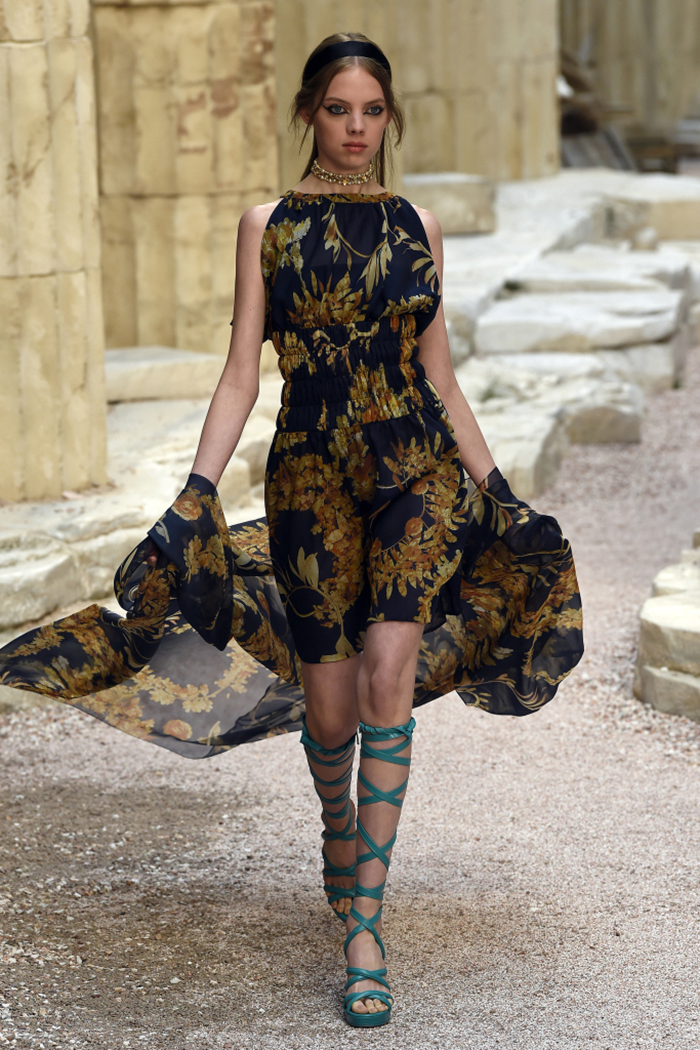 Banks of powerful lights created the illusion of Mediterranean sun, in contrast to the gray and drizzly sky that lurked behind the venue’s skylight, bathing a parade of modern-day goddesses strapped into colorful high-heeled gladiator sandals. After all, Lagerfeld said, it’s all about make-believe.