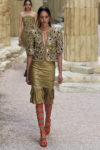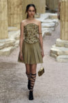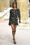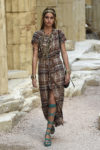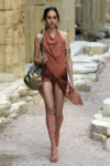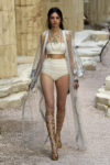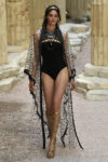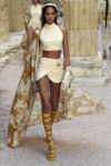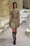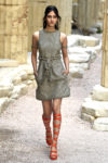 Banks of powerful lights created the illusion of Mediterranean sun, in contrast to the gray and drizzly sky that lurked behind the venue’s skylight, bathing a parade of modern-day goddesses strapped into colorful high-heeled gladiator sandals. After all, Lagerfeld said, it’s all about make-believe.