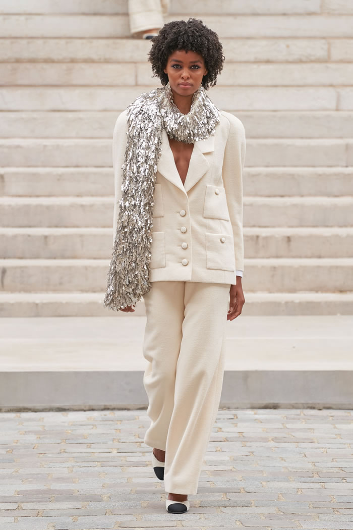 Meanwhile, a trio of cream pantsuits, styled with boas of Schlaepfer’s tinsel sequins—and hairdresser Damien Boissinot’s plaited faux-hawks—hint at Viard’s rock chick edge.