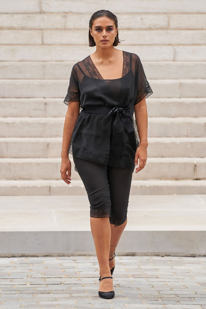 That airy spirit continues in the quirky way Viard marries bouffant skirts or even suits—made from “tweed” woven from narrow strands of multi-colored tulle and ribbon—with delicate bustiers of pale pink Broderie Anglaise or chalky lace, and lingerie-light chiffon and lace camisoles and bloomers that she aptly calls her “little deshabille.”