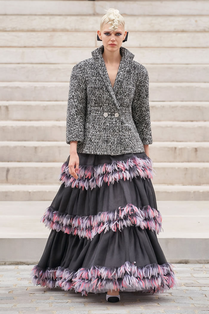 Lemarié’s incredible gardenia-strewn cardigan jacket (Look 21), crafted from feather strands, took 2,000 hours of expert handwork as Viard pointed out during a studio preview.