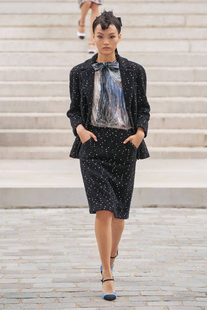 The bride, however, prettily personified by Margaret Qualley in a stately dress of soft pink satin, recalled the house’s pre-WWII era, worn as it was with a black pillbox hat accompanied by a veil scattered with clustered multi-colored sequins, based on one worn by Gabrielle Chanel herself in a 1930s pastel portrait sketch that now hangs in the Chanel studio.