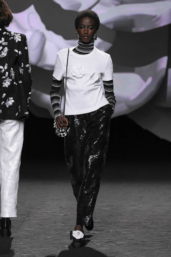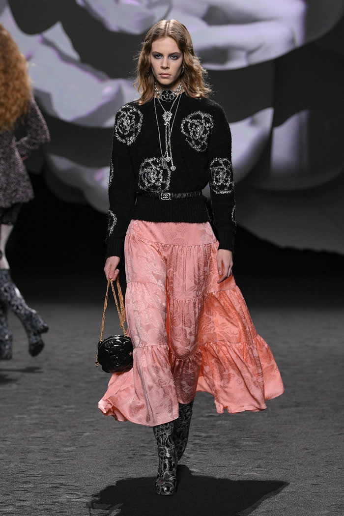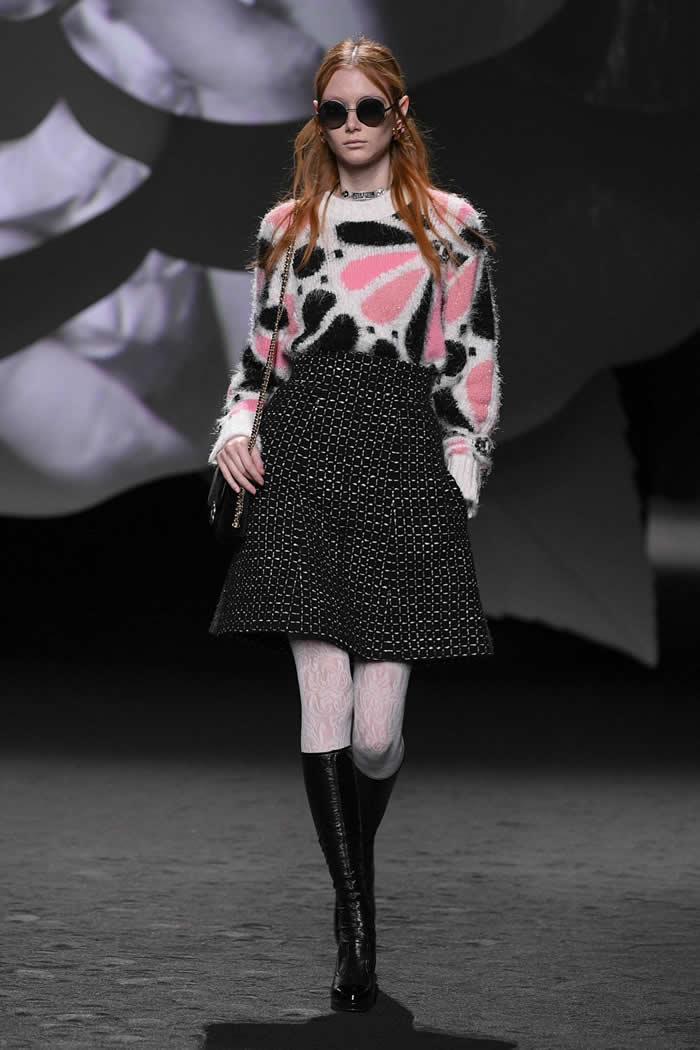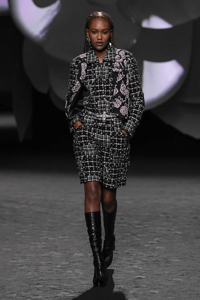 From the minutest of embroideries to the button-shapes to the big, fuzzy angora pattern on a sweater, and swinging on multiple chain bags, the flowers were absolutely everywhere. The formalities of the Chanel canon are constantly open to reinterpretation, as Karl Lagerfeld supremely taught.