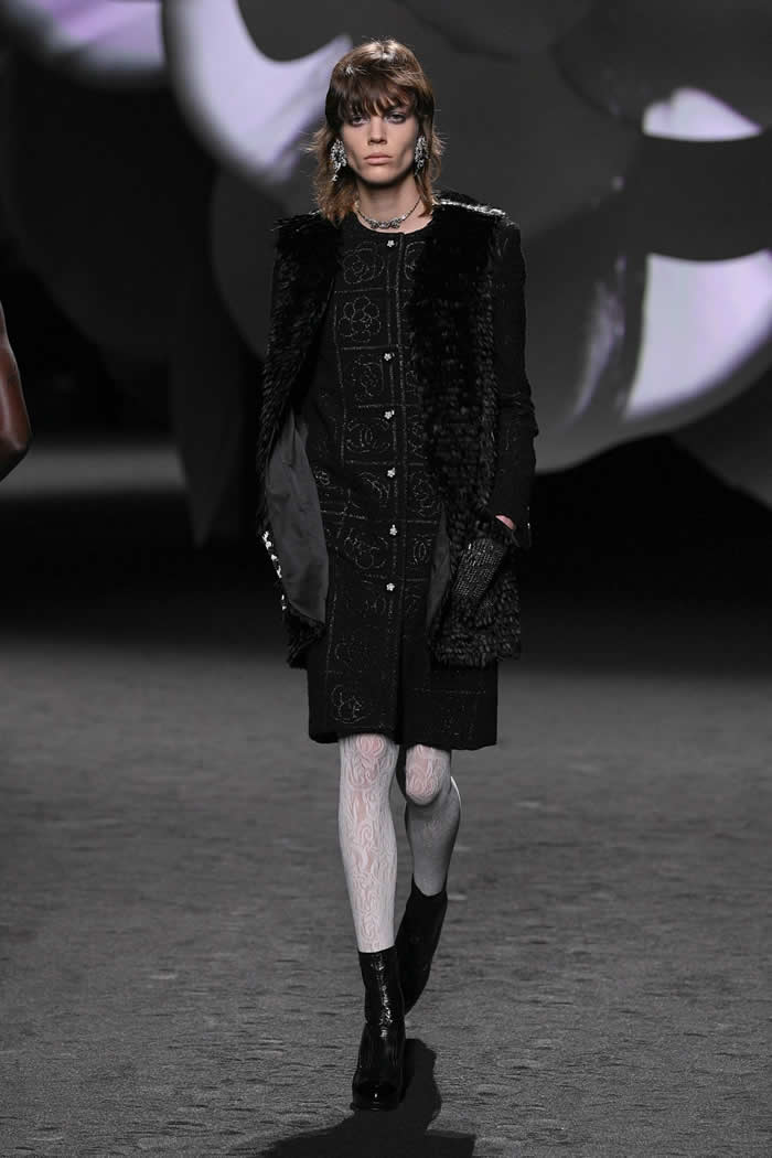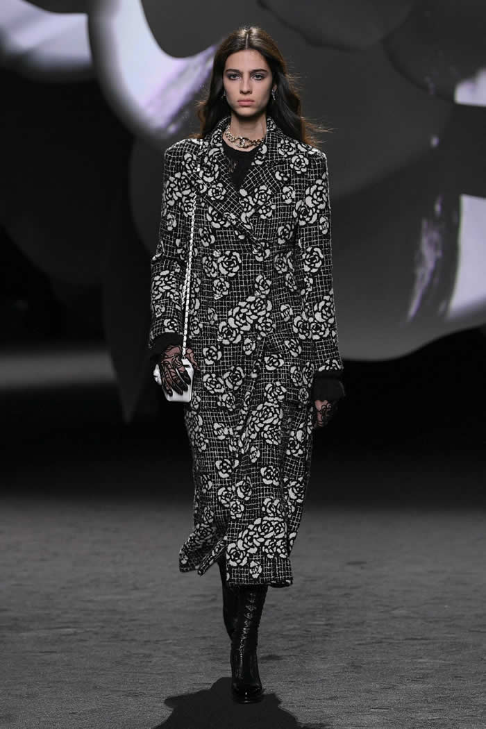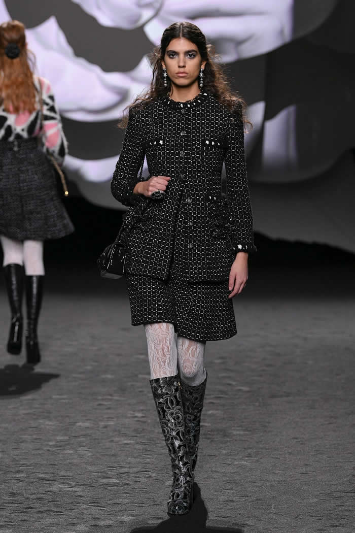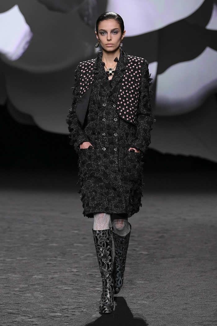 A taste for propagating a contemporary realness around Chanel’s enviable Frenchness is more Viard’s thing. Like so many others this season, she opened with variations of black, white, and gray. White camellias ran up a black trellis on a long, slim, tweed coat; they clustered as a corsage on slick black patent Mod-ish suits and popped up like polka dots all over cardigan jackets.